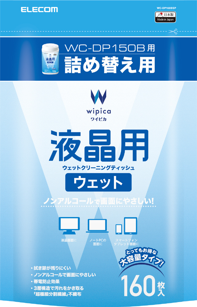 ウェットクリーニングティッシュ [140x120mm /160枚 /詰め替え用] 液晶用 WC-DP160BSP