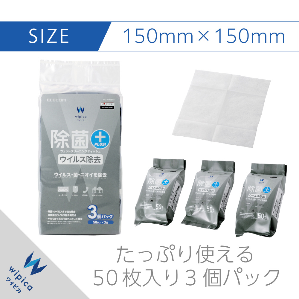 ウェットクリーニングティッシュ [150x150mm /50枚x3] 除菌・ウイルス除去 WC-VR150H3
