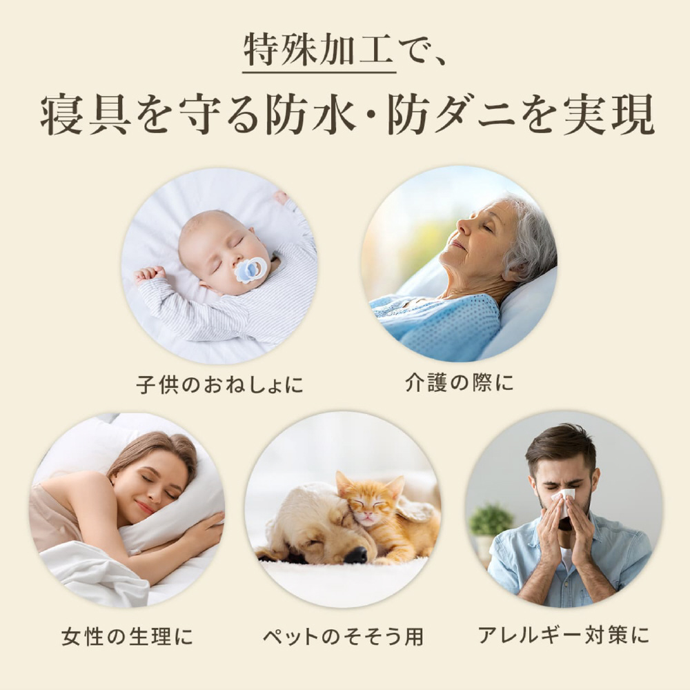 防水・防ダニと透湿性を兼ねそなえたミラクルシーツ。洗うことが難しいマットレスの衛生管理はお任せください。