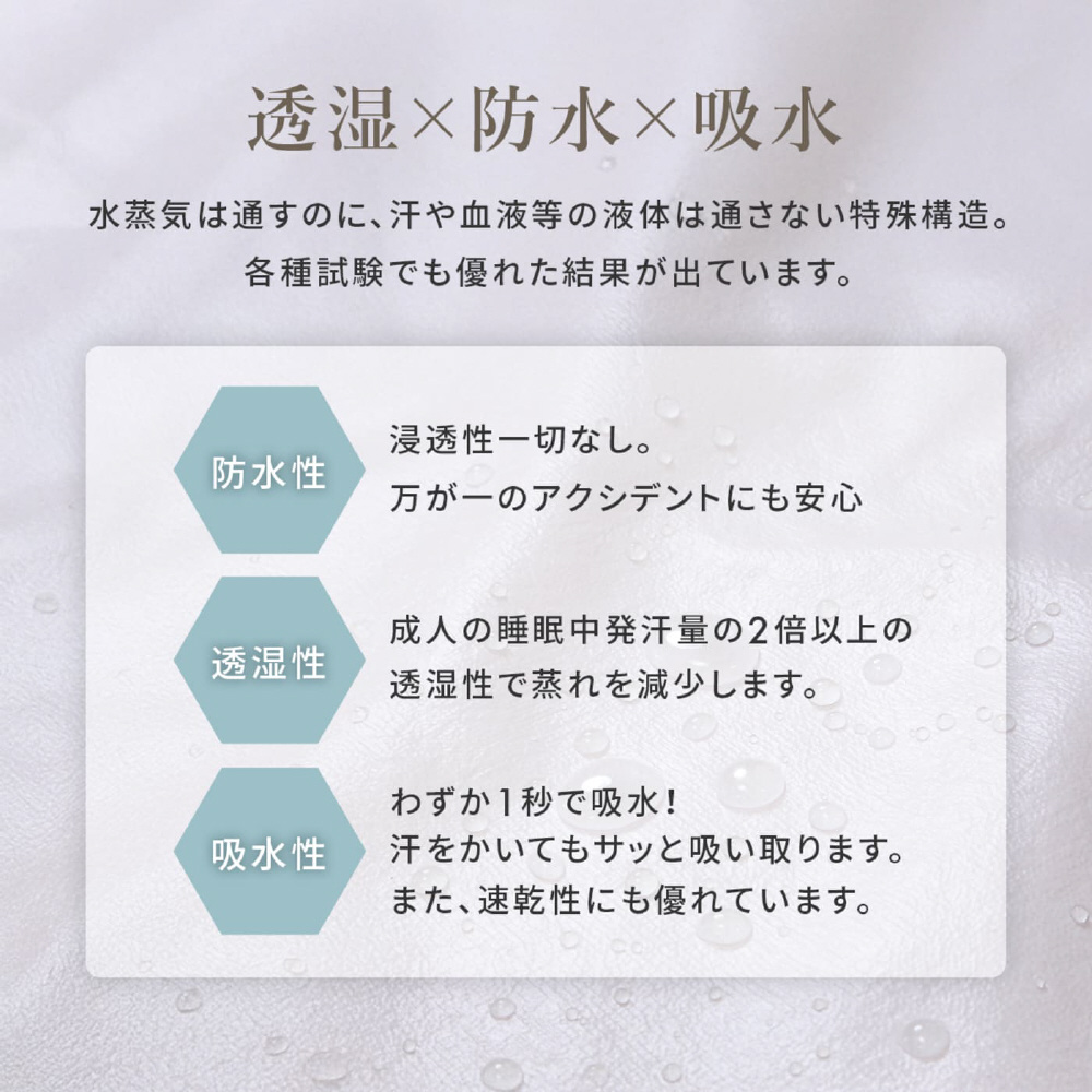セーブ・ユア・ベッドに採用されている防水膜の厚みはわずか0.02mm。そのため、防水性を持ちながらも透湿性を兼ね備えており、ムレにくく、ゴワゴワせず体に柔軟にフィットします。高品質のマットレスを使っていても、その寝心地を極力損なわない設計になっています。