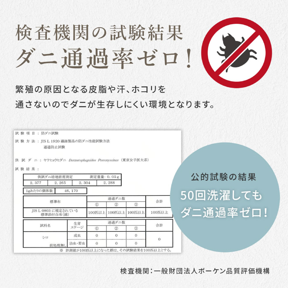第三者機関の検査において、50回洗濯を行った後でも、生地のダニの通過率が「0」であったとの結果が出ました。長く長く安心してお使いください。