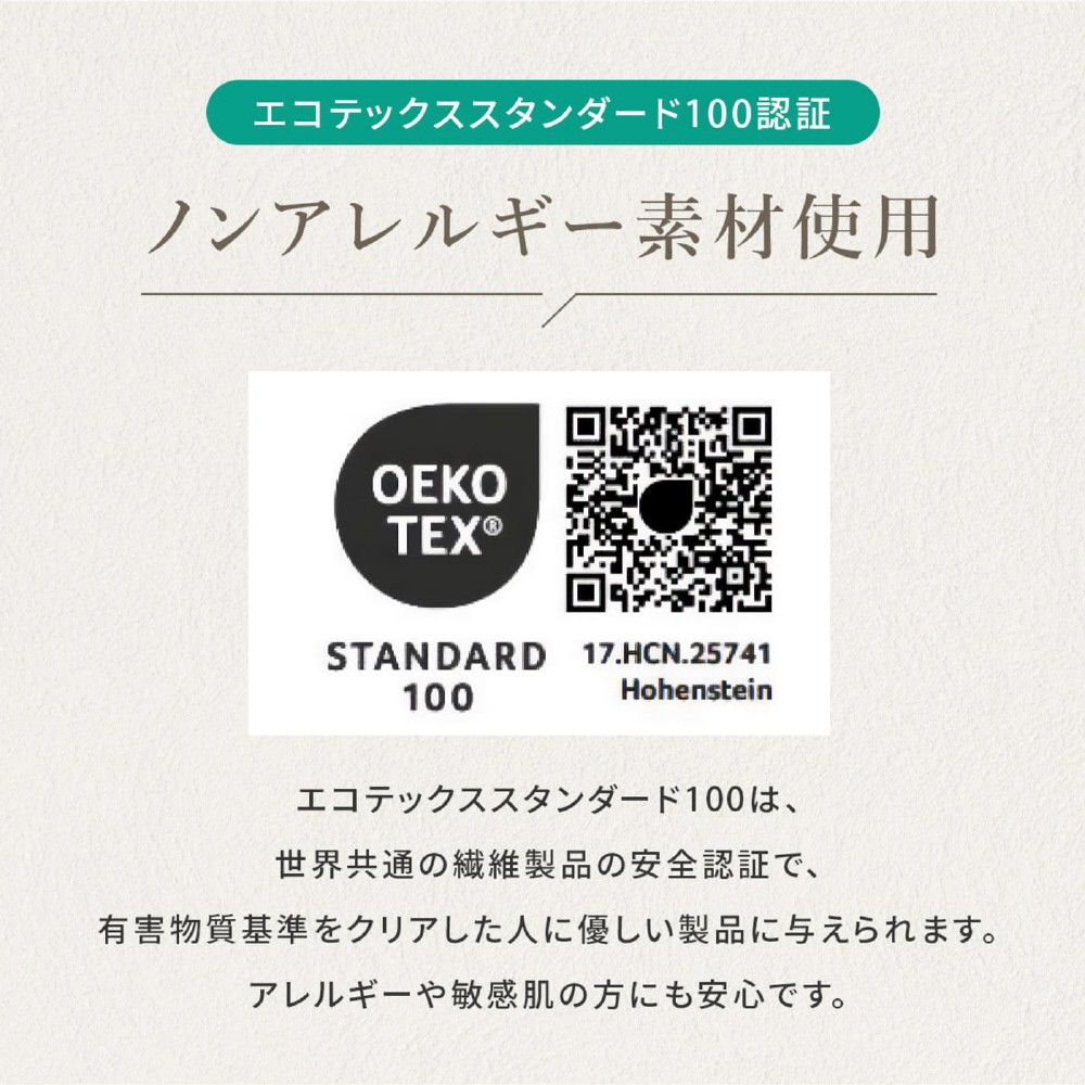 「エコテックス スタンダード100」は、有害化学物質試験にクリアした繊維製品のみに与えられます。これらの製品はすべて、有害化学物質に関する安全性試験クリアしています。中でも最も厳しいレベルの「クラス1」を取得。敏感肌や、アレルギー体質の方でも安心してお使いいただけます。
