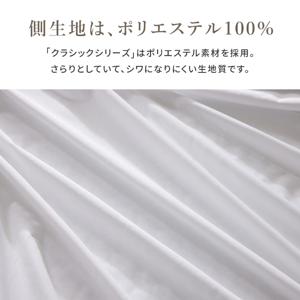 クラシックシリーズはポリエステル100%のスムースニット生地です。つるつるでさらっとした肌触りですが、繊維素材の特性上、そのまま上に寝ると夏場などはややムレを感じられることがあります。ベッドシーツやパッドを併用されることをおすすめします。
