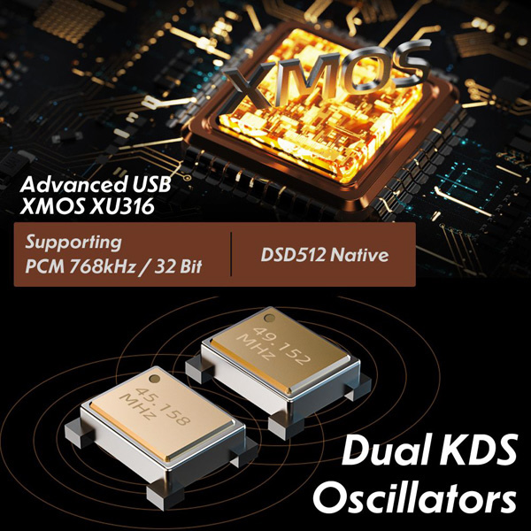 XMOS社16コアフラッグシップUSBチップ「XU316」と、45.1584MHz/49.152MHzの2基のKDS社アクティブ水晶発振器の組み合わせにより、USB-DACモード時(PCM 768 kHz / 32 bit & DSD512 Native)までのサンプリングレートをサポートしています。