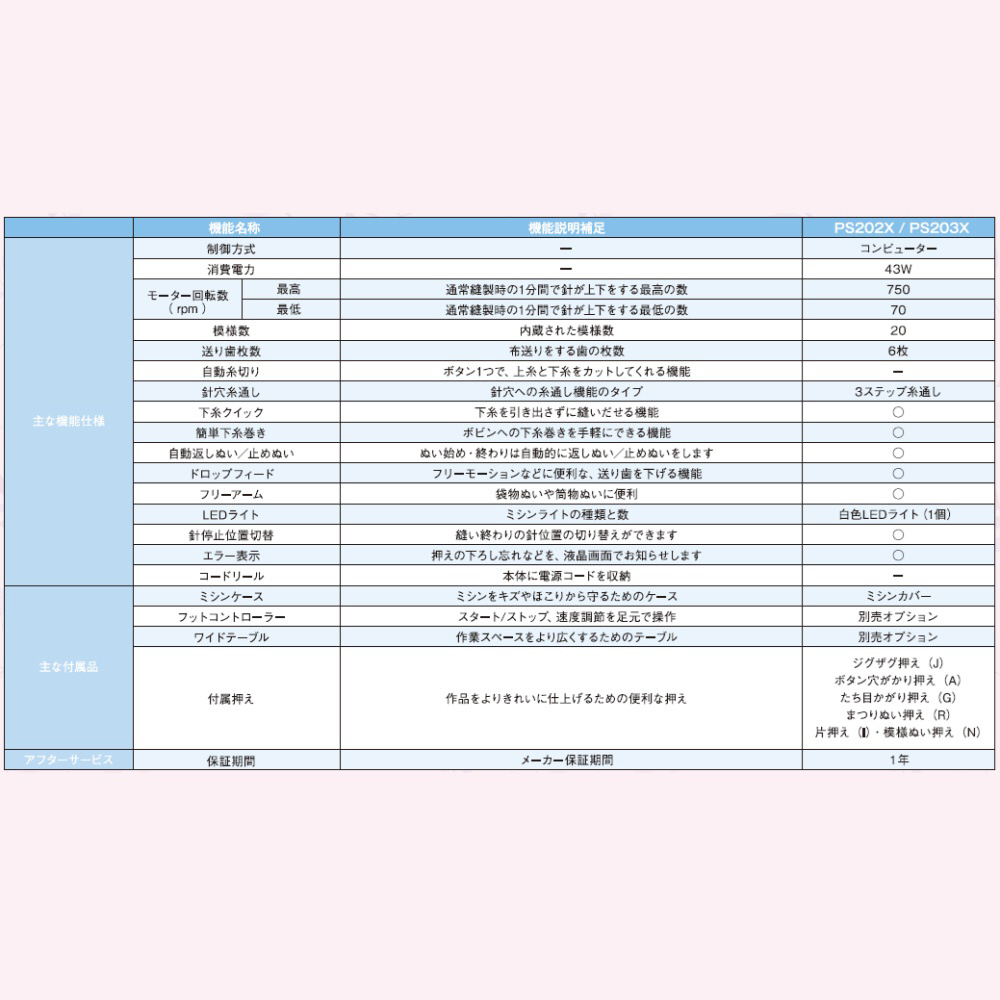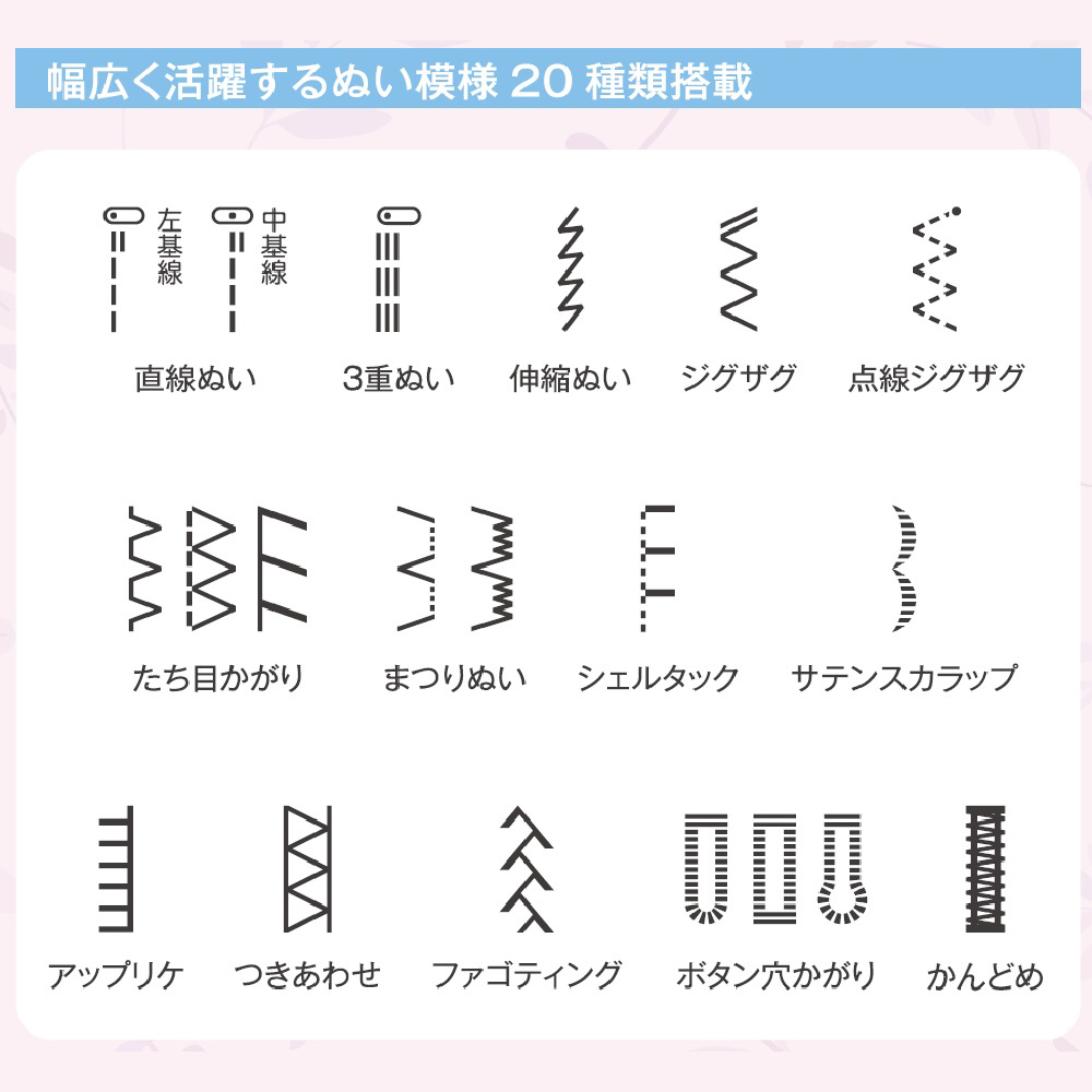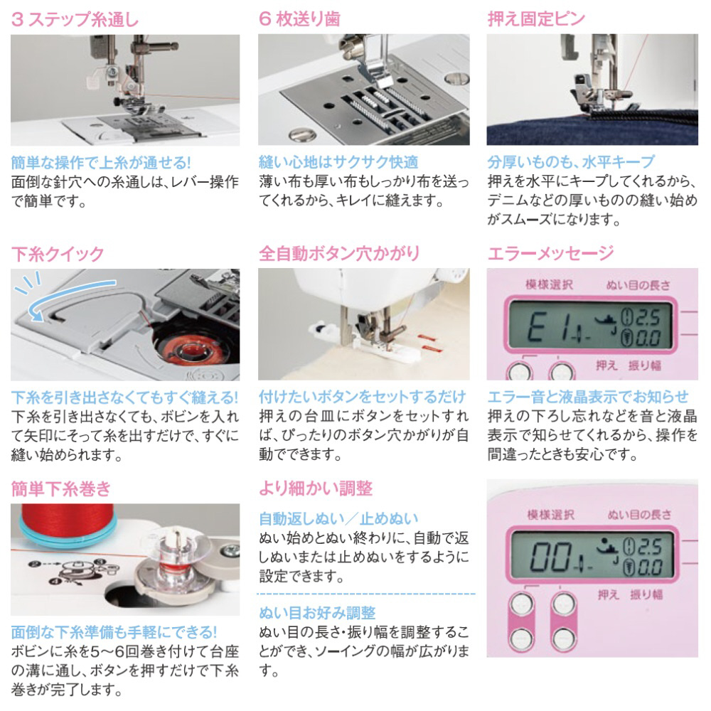 ジグザグ押え(本体に装着)・ボタン穴かがり押え・たち目かがり押え・模様ぬい押え・片押え・まつりぬい押え・リッパー・取扱説明書・かんたん操作ガイド・ボビン・L型ネジ回し・針・ソフトカバー・電源コード