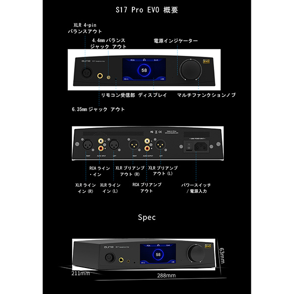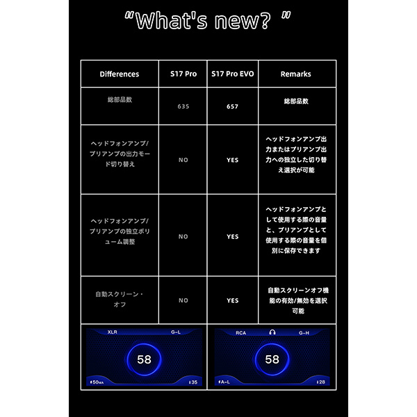 S17 ProEVOには、高品質な電解コンデンサ、セラミックコンデンサ、有機薄膜コンデンサなど、音質向上に貢献する厳選された部品が使用されています。S17Proからさらに使われているパーツにこだわり、総部品数は20個以上増えました。また、出力部ごとのヴォリュームのメモリ機能やディスプレイ表示機能も強化されました。