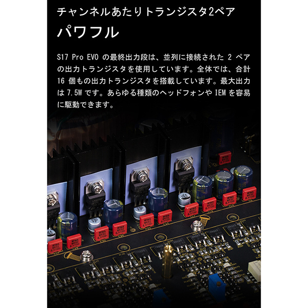 チャンネルごとに2つのトランジスタを使用し、16個の並列接続された出力トランジスタを備えたS17 ProEVOは、最大7.5Wの出力を実現し、あらゆる種類のヘッドフォンやIEMを効果的に駆動します。