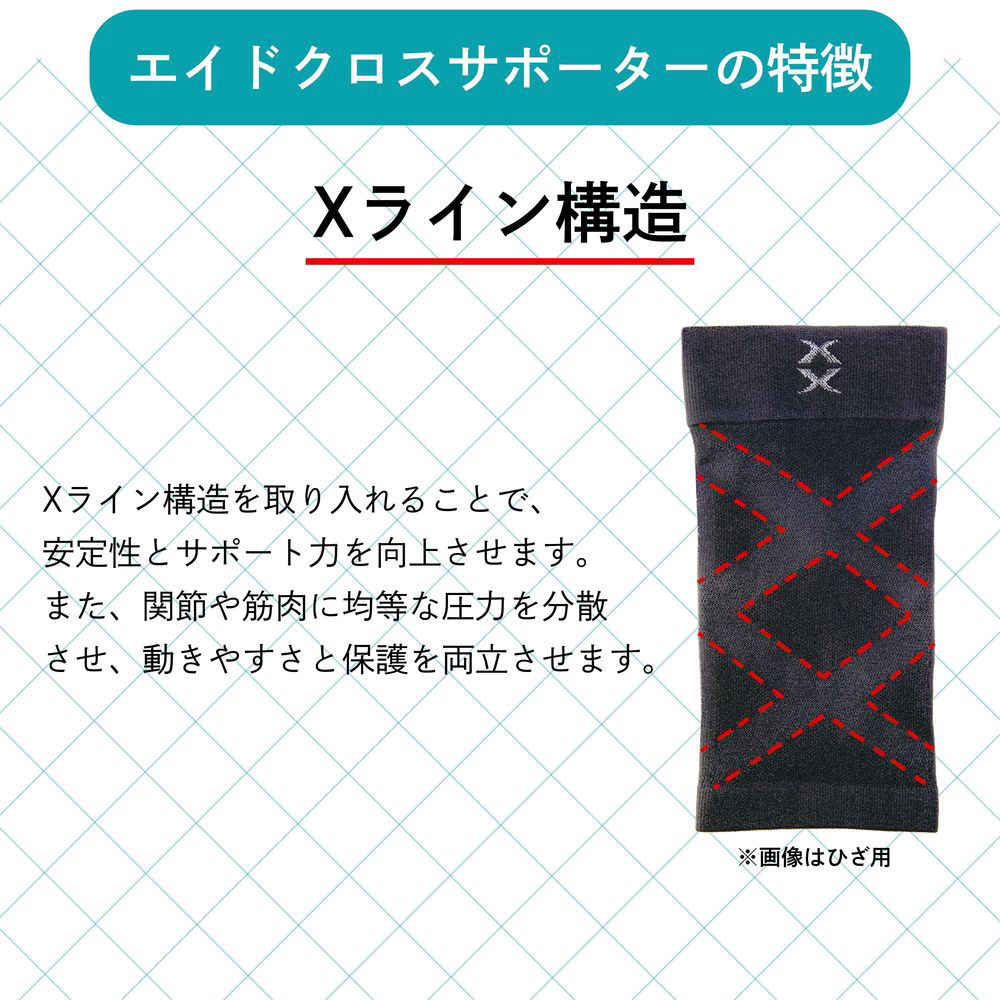 自由に動ける。これがエイドクロスサポーターのカタチ。動き続けられる快適サポート。日常に寄り添う装着感。やさしい着け心地なのにしっかりサポート。一日中快適に着けられるサポーターです。【エイドクロスサポーターの特徴】●Xライン構造。Xライン構造を取り入れることで、安定性とサポート力を向上させます。また、関節や筋肉に均等な圧力を分散させ、動きやすさと保護を両立させます。●軽量で通気性のある素材。快適さと機能性を確保するため、軽量で通気性のある素材そ使用しています。[手首用]手首の動きを邪魔せず、しっかりサポート。・独自のXラインが、親指の稼働を抑制し負担をサポート。・手首部分は、圧をかけて動きを抑制し軽減。【仕様】1枚入り●男女兼用●左右兼用●手洗いOK●適応サイズ(手首周り)/M:11-14cm L:14-17cm LL:17-20cm