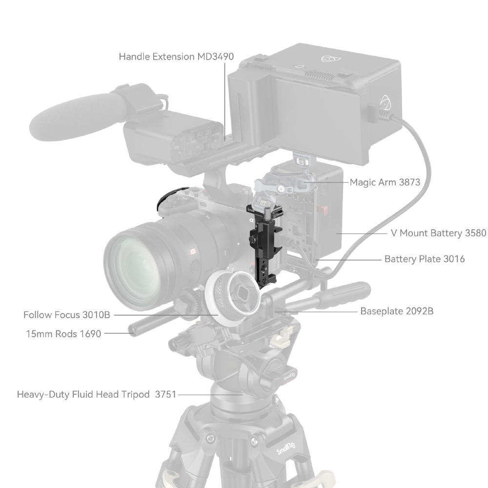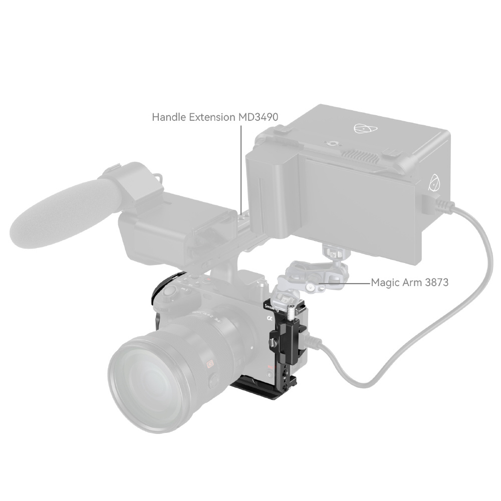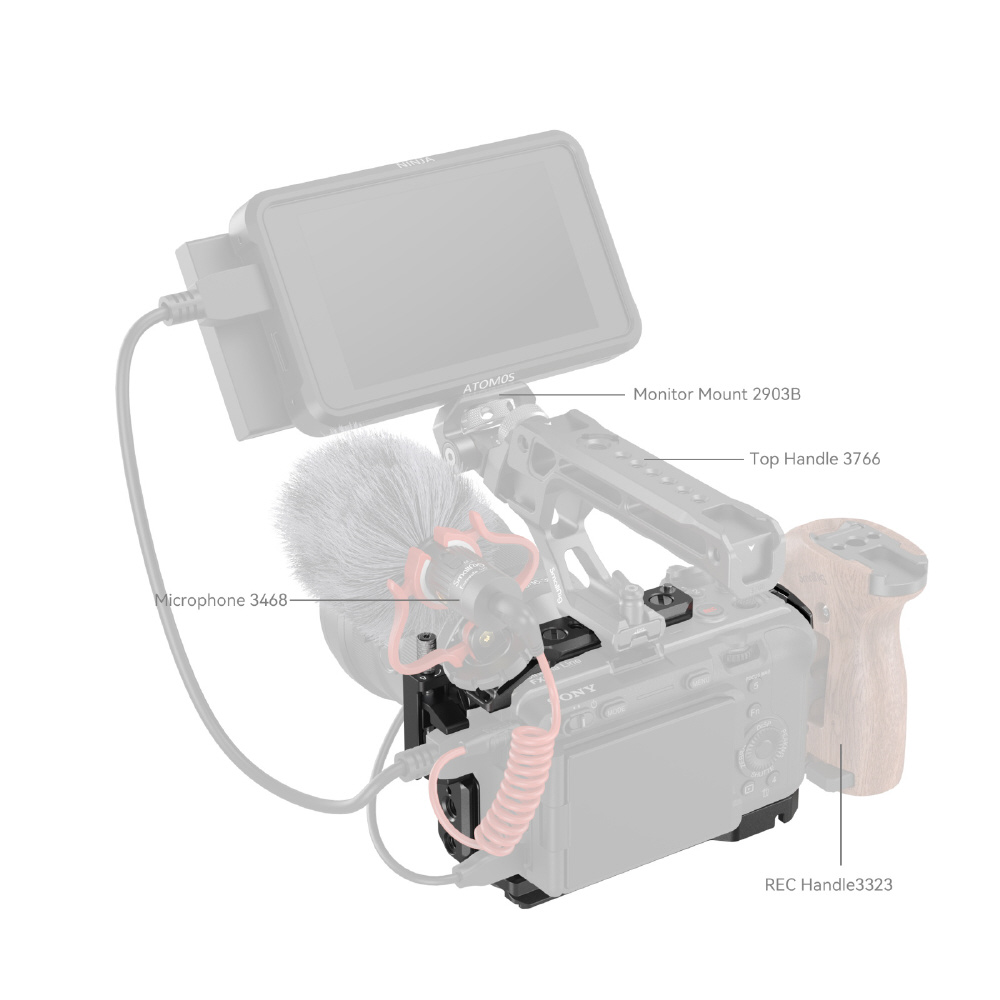 ・1/4”-20 ネジ穴、ARRI 3/8”-16 位置決め穴、コールドシューマウント、NATO レール、ハンドル、マイク、LED ライト、モニター、ハンドストラップなどの QD ポート。