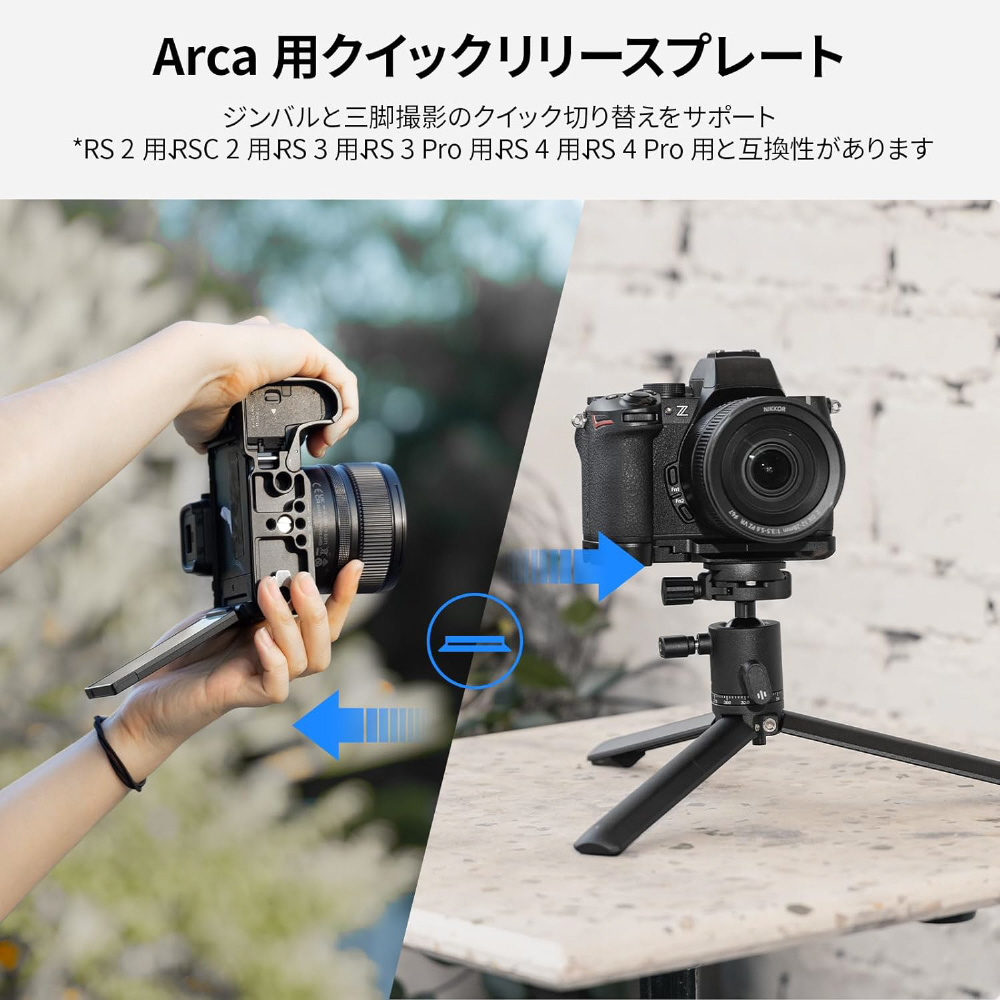 【Arca 用クイックリリースプレート】 Arca-Swiss クイックリリースプレートが統合されており、Arca タイプの三脚、ハンドヘルドセットアップ、DJIに対応 RS2用、RSC 2用、RS3用、RS3 Pro用、RS4用、RS4 Pro 用スタビライザー間の素早い移行が可能で、シーンの変更が楽になります。