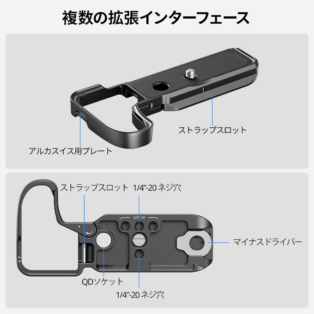【複数の拡張インターフェース】内蔵の 1/4”-20 ネジ穴がグリップに接続します (型番 4551)。底部の QD ポートは QD ショルダー ストラップ (型番 4118) と互換性があり、ストラップ ホールはリスト ストラップ (型番 3848) と互換性があります。