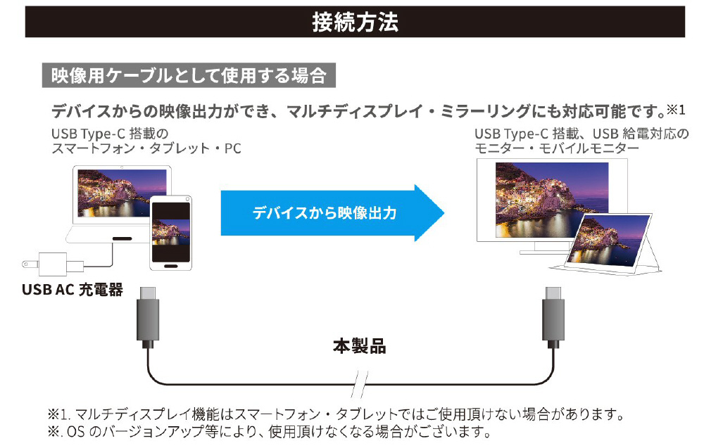 Type-C(DisplayPort Altモード対応)搭載機器(パソコン・スマホ)と、Type-C(DisplayPort Altモード対応)の入力端子を持つモニター・ディスプレイを接続して使用することができます。