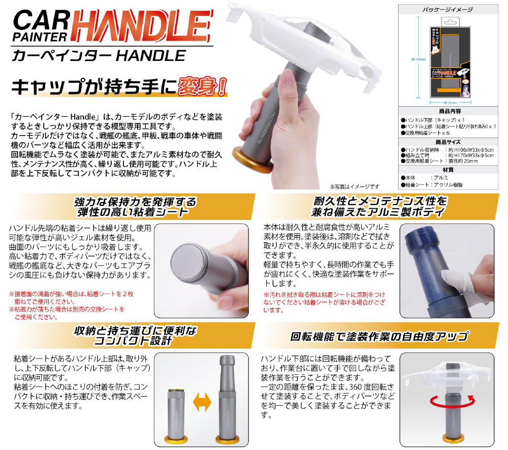 ハンドル先端の粘着シートは繰り返し使用が可能なジェルを使用。曲面のパーツにもしっかり吸着します。高い粘着性で、大きなパーツやエアブラシの風圧にも負けない保持力があります。