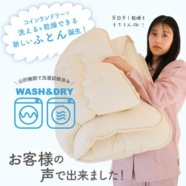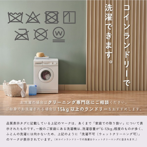 ※かさ高が高く、ボリュームのあるおふとんですので、容量15kg以上の洗濯機が設置されているコインランドリー等をご利用ください。