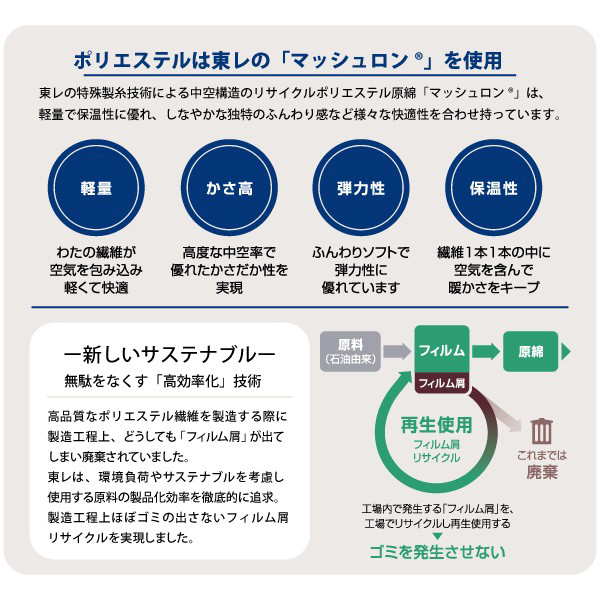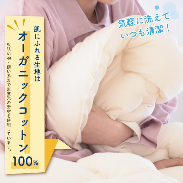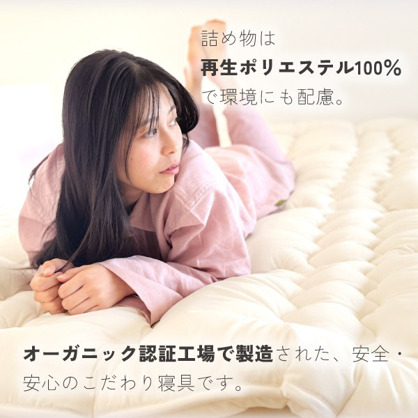 肌に触れる部分はオーガニックコットン100%、中わたには再生ポリエステルを使用し、環境にも配慮しています。