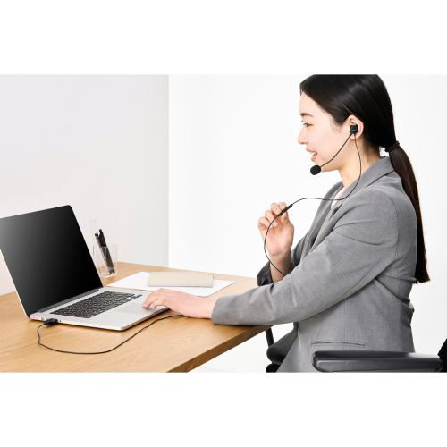 Web会議やビデオ通話、オンライン学習やオンラインゲームでのボイスチャットに最適なマイクアーム搭載の片耳耳せんタイプのカナル型有線ヘッドセットです。