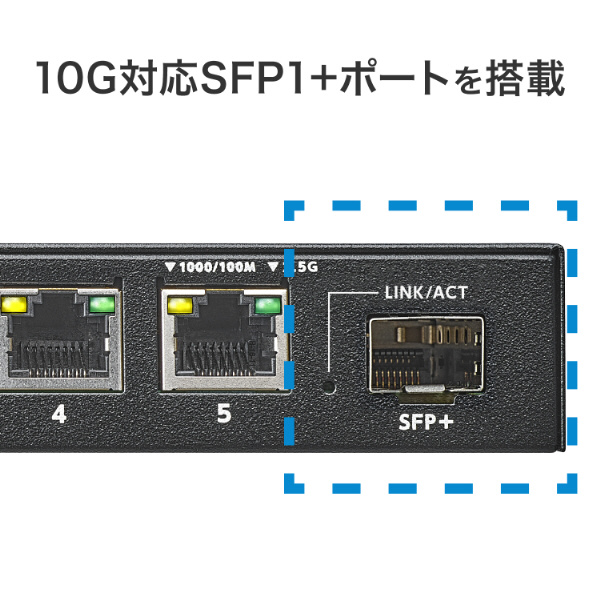 10G対応のSFP+ポートを搭載しており、SFP+モジュールを使用することで、10Gbpsでの通信も可能です。