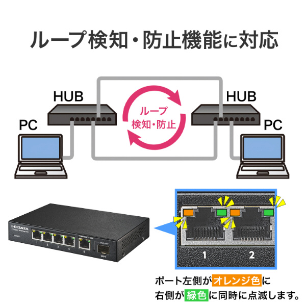 本商品はループ検知・防止機能を備えており、ループ接続を検知すると対象ポートを自動的に遮断。
