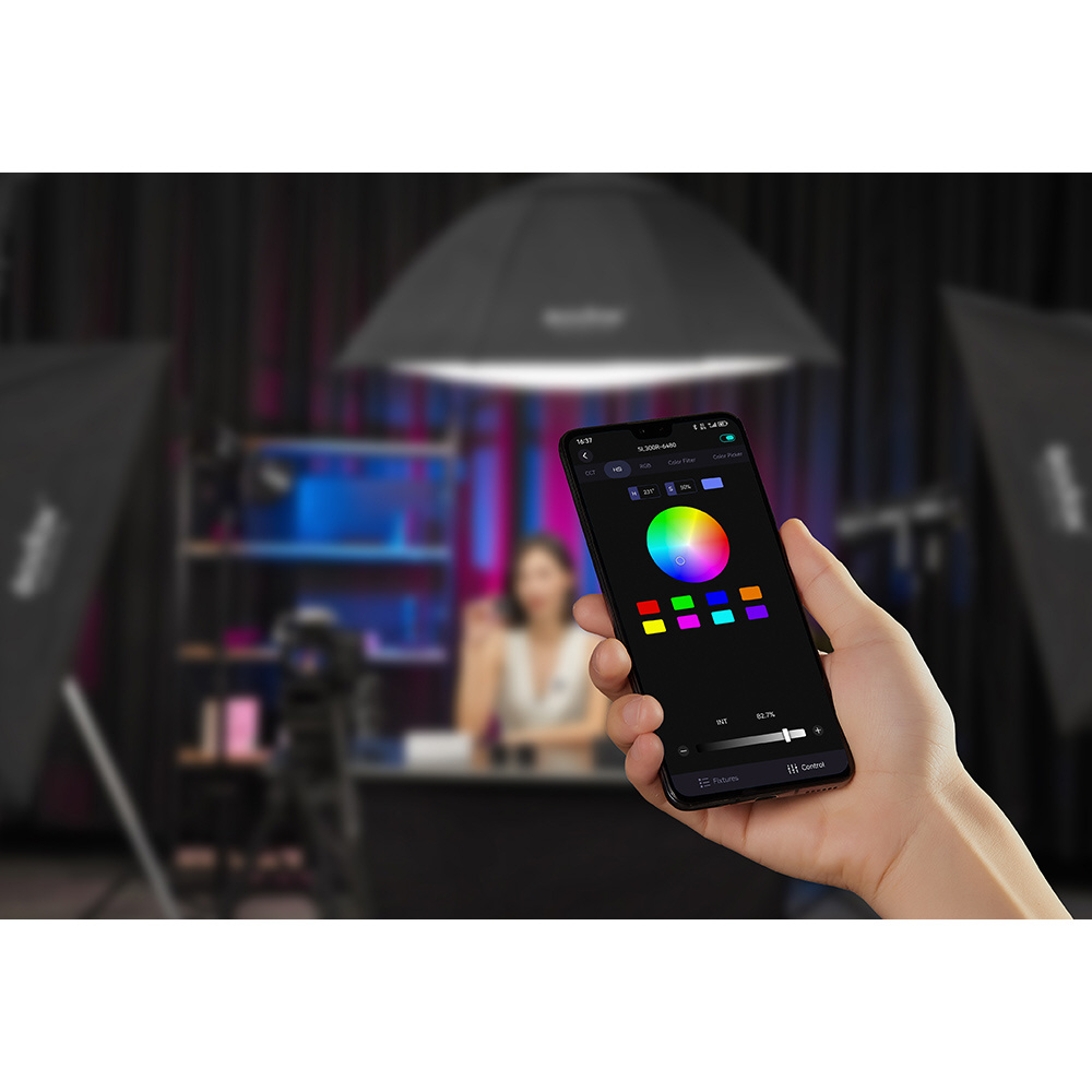 パワフルな出力と安定の性能で、様々なライブストリーミングやビデオ撮影に対応。HSI、RGB、GELモードでカラー制御が自在に行えます。色温度は2500-10000Kをカバーします。制御は、アプリ、リモコン(別売)、DMX512、オンボードなど、複数のアプローチが可能です。またBowensマウントを採用していますので、幅広いアクセサリーとの互換性を持ちます。