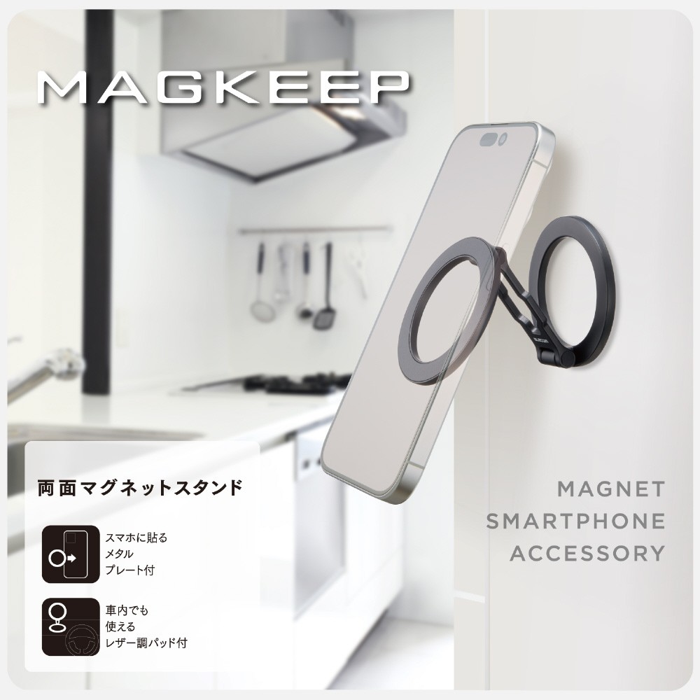 机や壁などにくっつけて使える!磁石がつく場所に簡単にスマートフォンを固定できる、MAGKEEPシリーズのマグネットスタンドです。MagSafe非対応機種にも対応するメタルプレート付き。キッチンや冷蔵庫に固定すれば、レシピ動画を見ながら料理ができるのでとても便利です。付属のレザー調パッドを車のダッシュボードに貼り付けることで、ドライブ中の振動によるスマートフォンの落下を防ぎます。