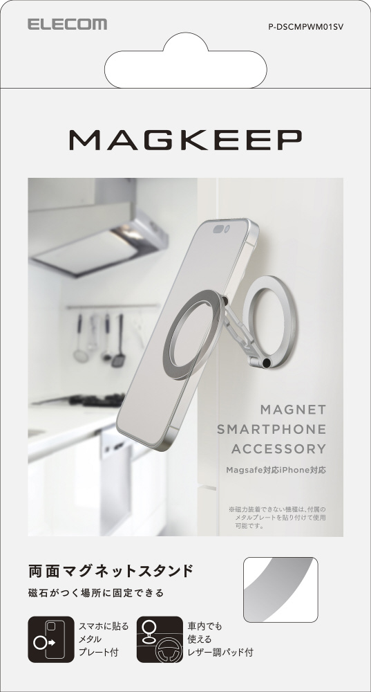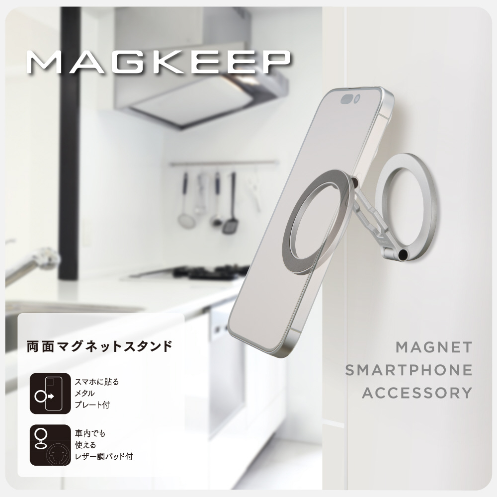 机や壁などにくっつけて使える!磁石がつく場所に簡単にスマートフォンを固定できる、MAGKEEPシリーズのマグネットスタンドです。MagSafe非対応機種にも対応するメタルプレート付き。キッチンや冷蔵庫に固定すれば、レシピ動画を見ながら料理ができるのでとても便利です。付属のレザー調パッドを車のダッシュボードに貼り付けることで、ドライブ中の振動によるスマートフォンの落下を防ぎます。