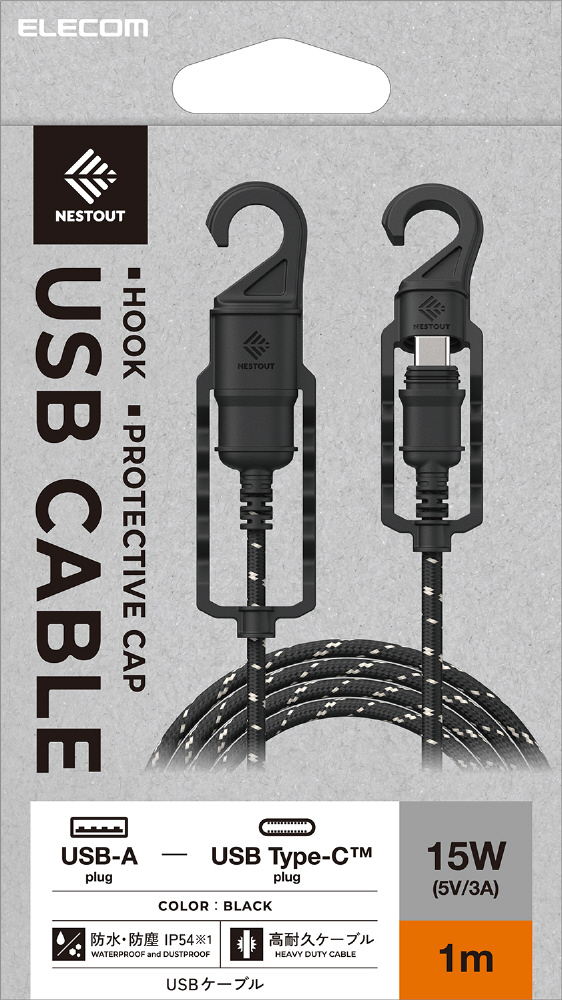 USB Type-C ケーブル < USB-A to USB-C > 1m 高耐久 先端保護 キャップ一体型フック付 IP54 防水/防塵 高速データ転送 充電ケーブル 【 Type C ポート搭載 iPhone iPad Android Xperia 等対応 】 NESTOUT