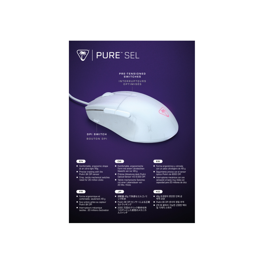 Pure SEL ワイヤレスゲーミングマウスは、10 年以上にわたる Kone の人間工学研究の成果を 49g の超軽量設計に反映させました。