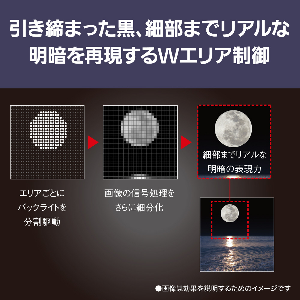 ミニLEDバックライトで明るく色鮮やかな映像を実現しています。分割数アップでより高コントラストな映像を実現しています。