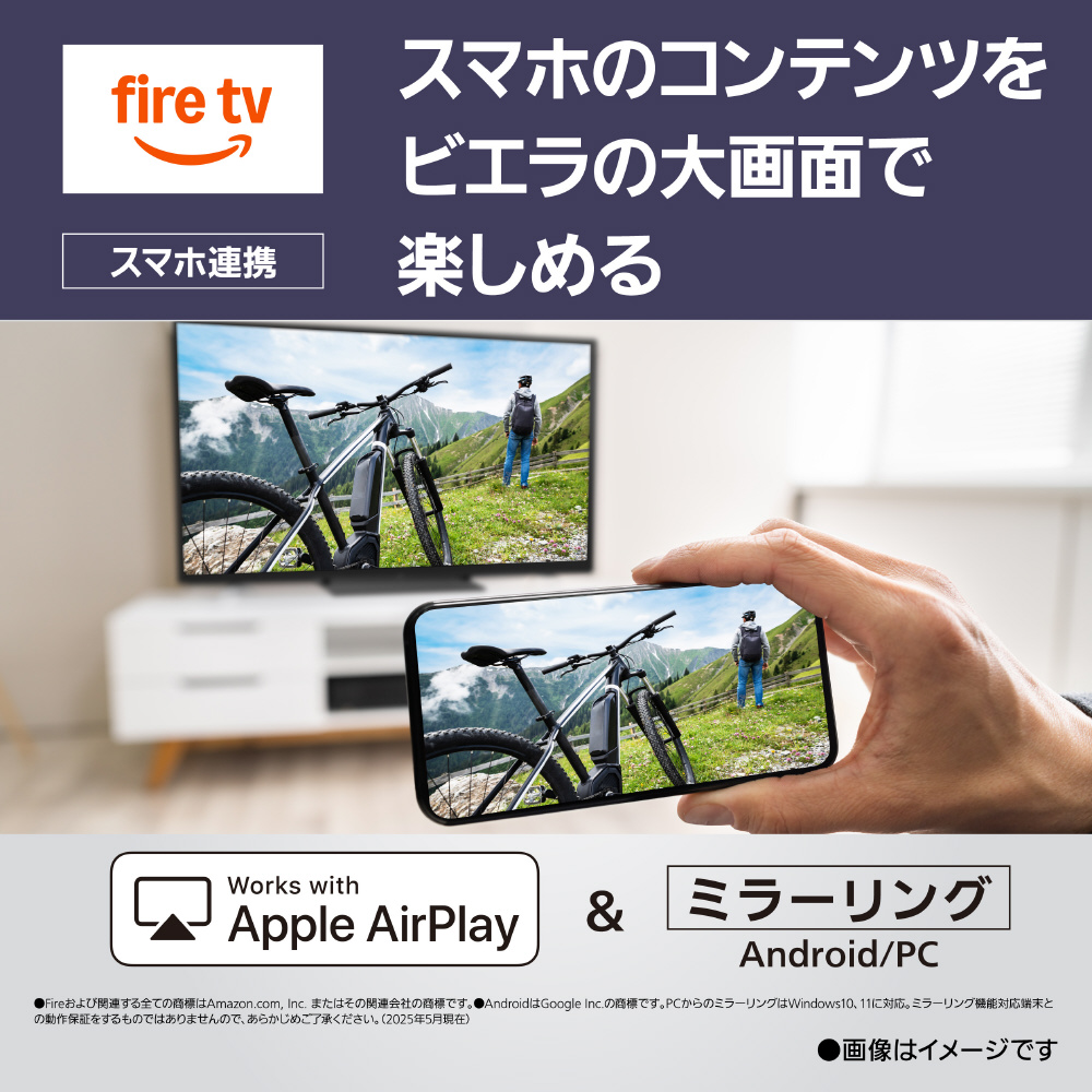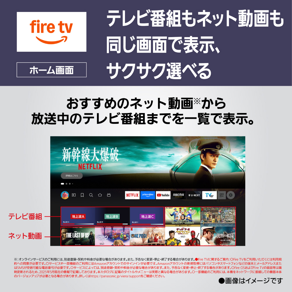 ※●Fire TVに関するご案内:〇Fire TVをご利用いただくには利用規約への同意が必要です。〇サービスや一部機能のご利用にはAmazonアカウントでのサインインが必要です。Amazonアカウントの新規取得にはパソコンやスマートフォンなどの端末とメールアドレスまたはSMSが受信可能な電話番号が必要です。〇サービスによっては、別途登録・契約や料金が必要な場合があります。また、予告なく変更・停止・終了する場合があります。〇Fire OSおよびFire TVの画面等は随時更新されるため、2025年5月現在の情報で記載しております。本サイトに記載のタイトルやメニューは実際と異なる場合があります。〇一部機能の利用には、本機をネットワークに接続しての機器本体のバージョンアップが必要となる場合があります。詳しくはhttps://panasonic.jp/viera/supportをご確認ください。オンラインサービスのご利用には、別途登録・契約や料金が必要な場合があります。また、予告なく変更・停止・終了する場合があります。
