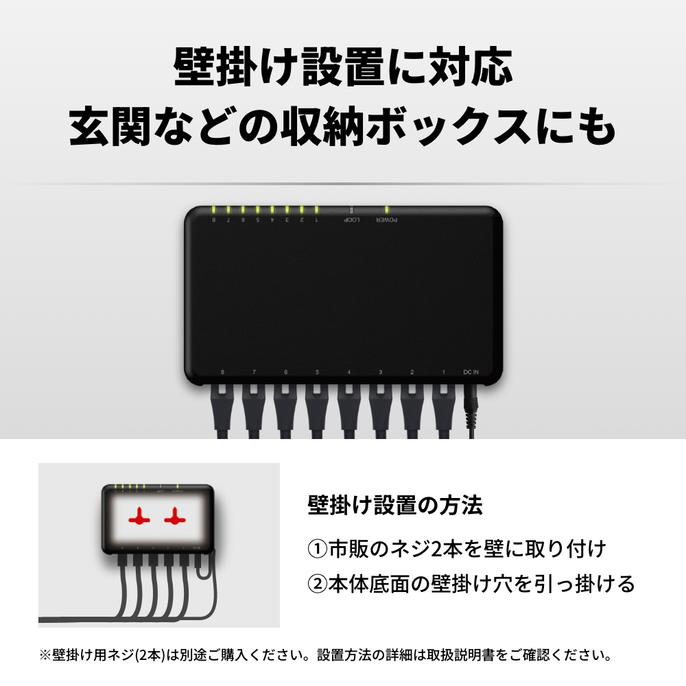 本商品は、壁面設置用ネジ穴付きスイッチングハブです。 機器用の収納ボックスへ固定設置ができ、ルーターや電源タップとまとめてスッキリ収納できます。配線が複雑になりがちな、収納ボックス内への設置に最適です。
