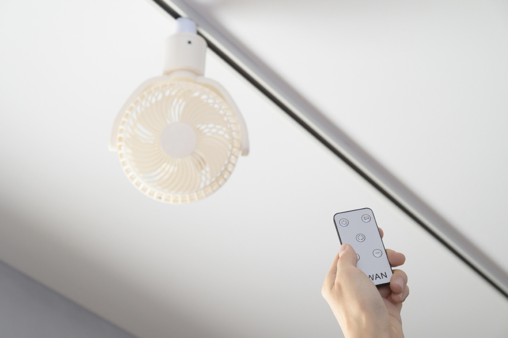 広い稼働範囲に加え、付属のリモコンを使えば120°の自動首振りが可能。お部屋の空気を撹拌し、冷暖房の温度ムラを解消します。風量も6段階で調整可能です。
