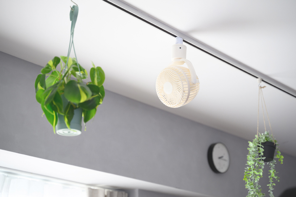 扇風機型だから、天井から最大4m先までピンポイント送風が可能。熱がこもりやすいキッチンや脱衣所の換気、ハンギンググリーンへの送風にも最適。