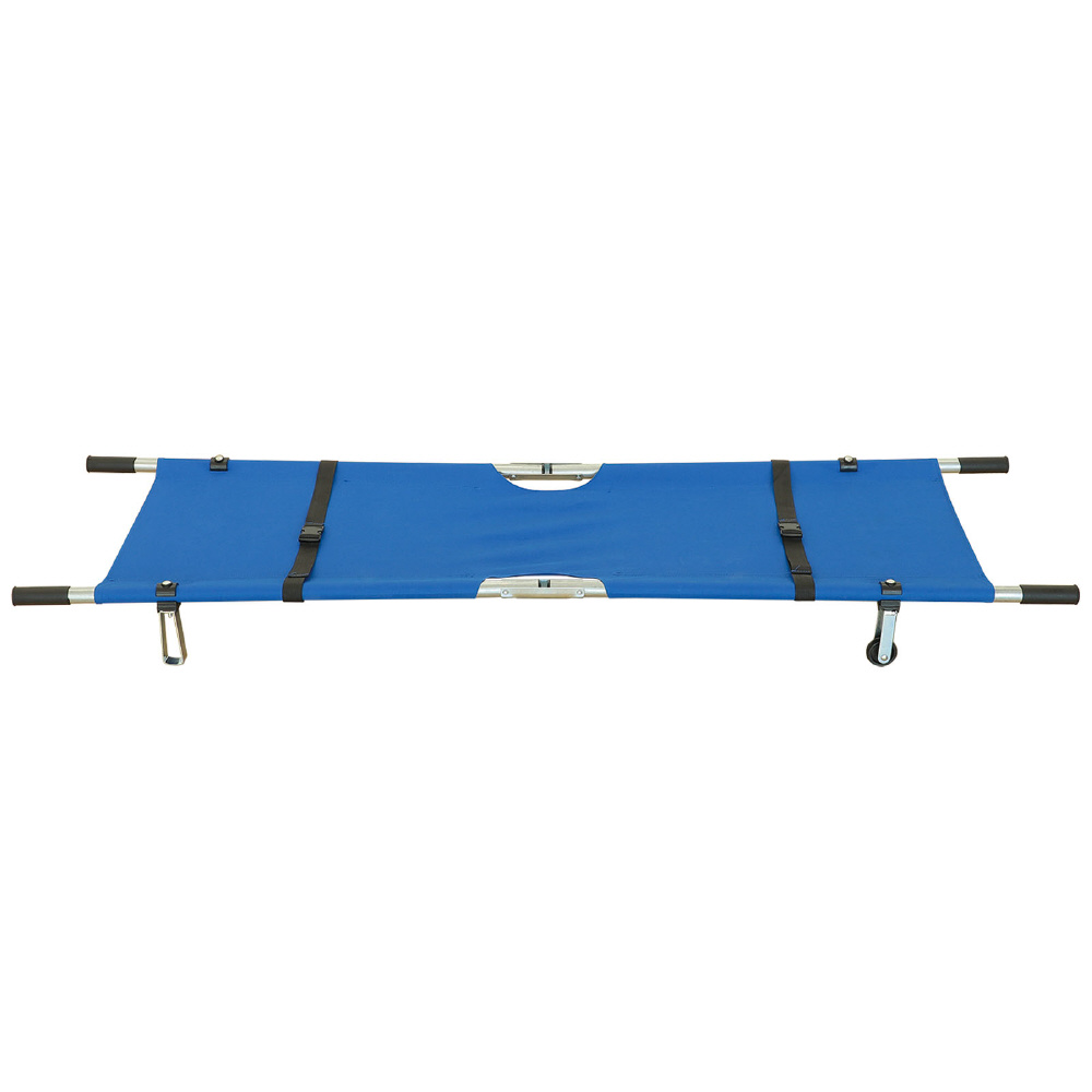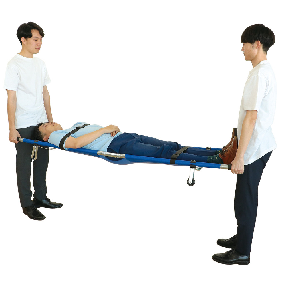 未使用時は折りたたんでコンパクトに収納できる担架です。ベルト付きで安全、キャスター付きで運びやすい!耐荷重:150kg。