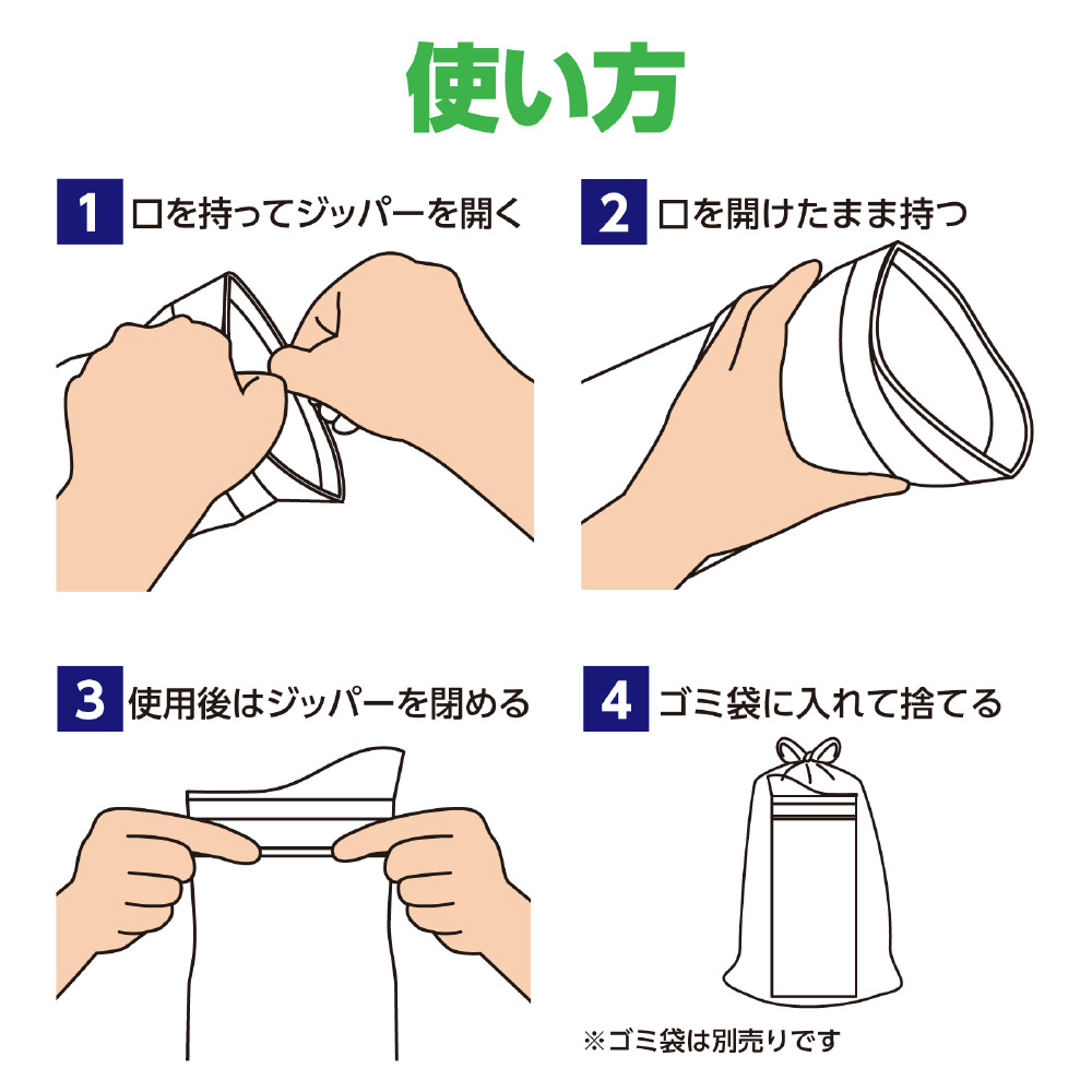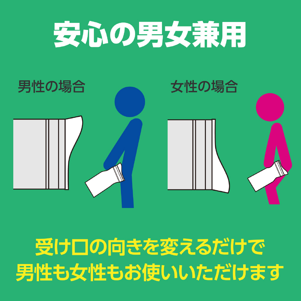 緊急時に便利な携帯簡易トイレです。700mlの大容量であらゆる状況に対応できます。男女兼用の設計です。袋の口は柔らかい素材を使用しているので、安心して使えます。袋自体に吸水機能がついているので、吸水後の水漏れがない構造になっています。吸水性がよく、排尿後すぐに固まります。ポリマーを使用しているので臭いを消して、飛び散らないジェル状に変わります。災害時や渋滞、レジャーなどに!