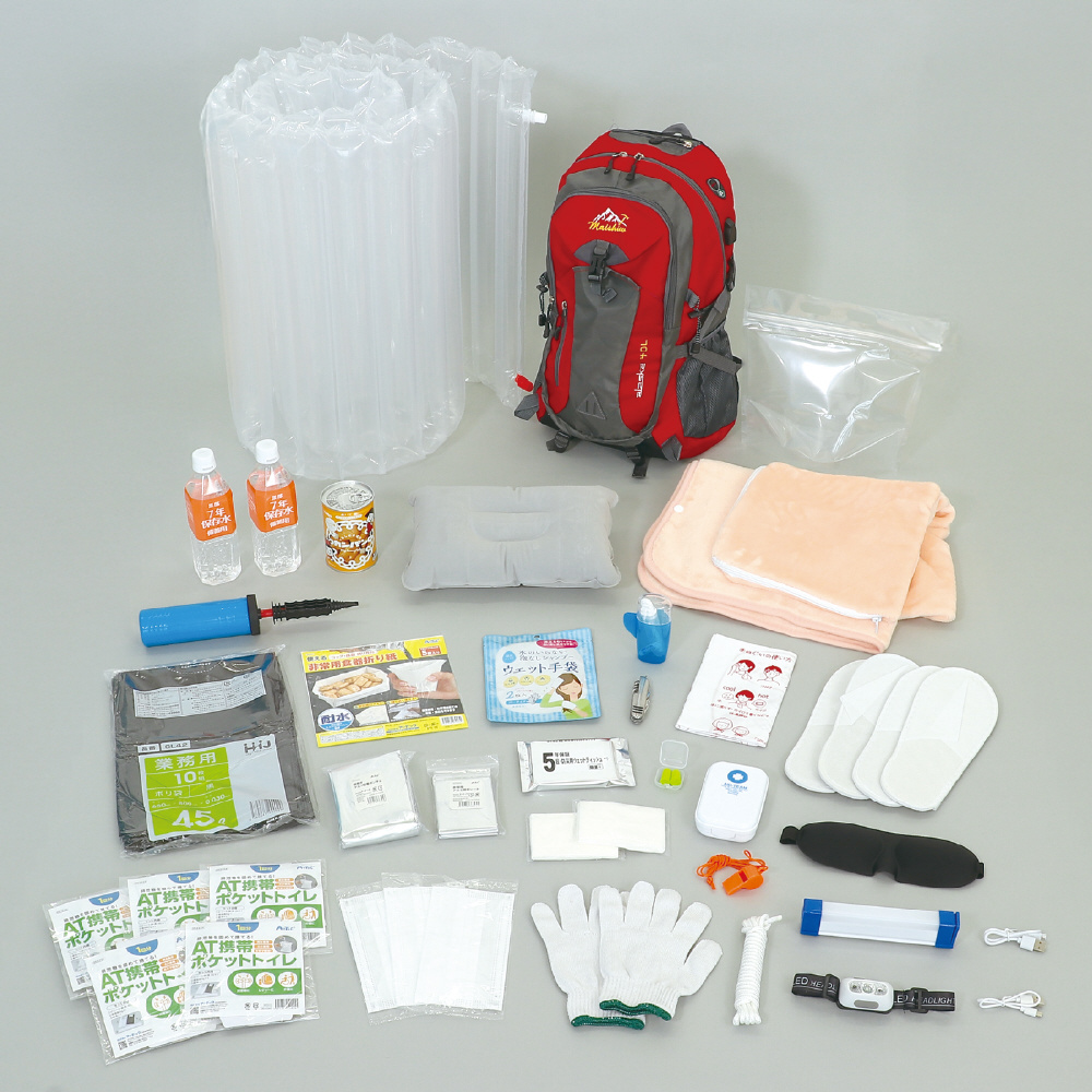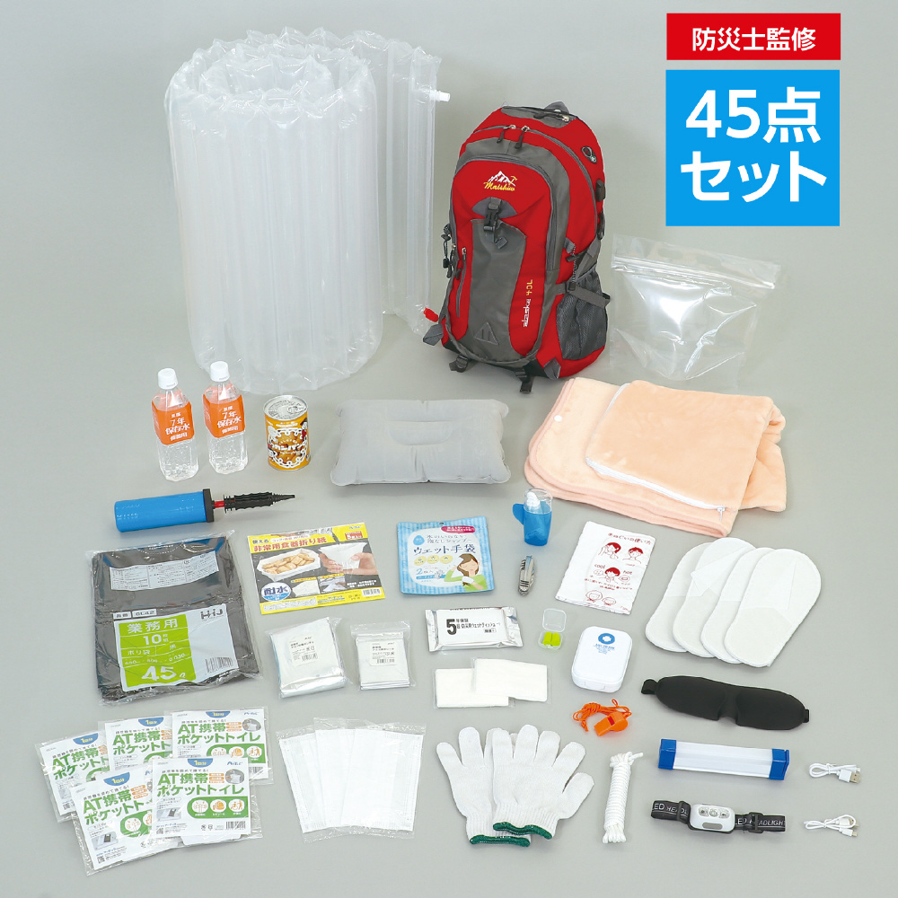ライフライン復旧までに必要な分の非常食・保存水を含めた防災セットです。基本的な45点をセットにしています。防災士監修の厳選したアイテムを備えています。【内容】・大容量リュックレッド:複数のサブポケットで大容量だけどすっきり収納できます。バッグ本体に付属の充電用ケーブルを取り付けることができ、手持ちの充電器とつなげることでバッグから給電できます。バッグの底面、左右側面のベルトで内容物に応じてバッグの厚みを調整できます。・5年保証・超防災用ウェットティッシュ20枚入:業界最長、「5年保証」の防災用のウェットティッシュです。・ATトイレストック1回用:長期保存、非常時に使える水不要トイレです。丈夫で破れにくい汚物袋と水分を素早く吸収する凝固剤で、災害時に役立ちます。・2WAYLEDライト(17cm):緊急時や作業時に使用できるLEDライトです。持ち運びしやすく用途に合わせた使用が可能です。マグネット付きなので様々な場所に設置も可能!懐中電灯のように遠くまでスポットで照らせるトップLEDライトと、作業灯やデスクライトのように周囲全体を広く照らす側面LEDライトの2種類の点灯を切り替えることができます。充電時間:約6〜10時間、連続使用時間:約2.75時間。充電池内蔵。・非常用アルミ防寒シート:アルミ素材で保温に優れた防寒シートです。たためばポケットにも入るコンパクトサイズ。銀色でキラキラ光り目立つので、救出時の発見に役立ちます。・黒部7年保存水500ml:長期保存可能な保存水です。安心の加熱殺菌処理・耐熱ボトル使用。・不織布スリッパ:前閉じで履きやすい使い捨てスリッパです。・不織布マスク:ノーズワイヤー入りの不織布マスクです。衛生的な個包装。・エマージェンシー3点セット:軍手、ロープ、笛がセットになった緊急時に便利なセットです。・ポケットティッシュ:シンプルなポケットティッシュです。8組入り。・エイドチーム2:携帯しやすいプラスチックケース入り。綿棒10本、エイトバン5枚、ワンタッチ包帯1点、コットン3点、爪切り1点、ピンセット1点、はさみ1点のセットです。・非常用食器折り紙:水に強いストーンペーパーを使用しています。コップや皿の折り方付きで、災害時に役立ちます。水洗い可能なので、繰り返し使えます。緊急時のメモにも!・hokkaのカンパン:アレルギー物質の乳・卵を使わず、独自の製法で長時間イースト発酵させてからじっくりと焼き上げた飽きのこない素朴な味で、いつでもどこでも頼りになる、昔から変わらぬ懐かしい味が自慢です。金平糖は口解けが良く、水分の少ないカンパンを食べ易くしてくれます。プルトップの缶は手で簡単に開けることができるのでお子様でも簡単に開けられます。・歯ブラシセット:コップ型ケース、歯ブラシ、歯磨き粉の3点セット。(色取り混ぜ商品です。お選びいただけません。)・水のいらない泡なしシャンプーウェット手袋:水のない環境でも、髪や頭皮を清潔にする手袋型のウェットシートです。手袋だから使いやすく、驚くほどサッパリと清潔に。・ポリ袋45L(10枚入):中身が見えない黒いポリ袋です。簡易トイレやゴミ袋、防寒具としても使えます。立体スポンジアイマスク:避難所などでの安眠のために便利なアイマスクです。立体的でフィット感があります。・持ち運びエアー枕:空気を入れて膨らませる枕です。使用しないときはコンパクトに折りたためます。・耳栓:避難所などでのストレス削減に。環境音のみシャットアウトするので安心。・ATクッションブランケットピンク:大きめサイズのブランケットです。使わないときはケースに入れてクッションになります。・緊急用給水袋3Lマチ付:約3Lの水が給水できます。コンパクトでかさばらない!・非常用アルミ防寒ポンチョ:両手が使える防寒ポンチョです。軽量で動きやすく、コンパクトに収納できます。・センサー付ヘッドライト:手をかざすだけで点灯・消灯可能なセンシングモード搭載。二段階の調光機能。長さ調節可能なヘッドバンド(400〜1000mm)。USB充電式。・ポンプ付簡易エアーマット:最大厚み約60mmの簡易エアーマットです。避難所等での寝床として使用できます。・防災の心得手ぬぐい:緊急時・災害時に役に立つ情報がつまった手ぬぐいです。あると便利な防災グッズ、災害時の手ぬぐいの使い方が記載されています。名前・連絡先の記入もできます。・オールラウンドマルチツール:コンパクトなボディに9つの機能が収まったまさに万能ツール!ナイフ、缶切り、プラスドライバー、マイナスドライバー、やすり、コルク抜き、キーリング、栓抜き、はさみの9つの機能。