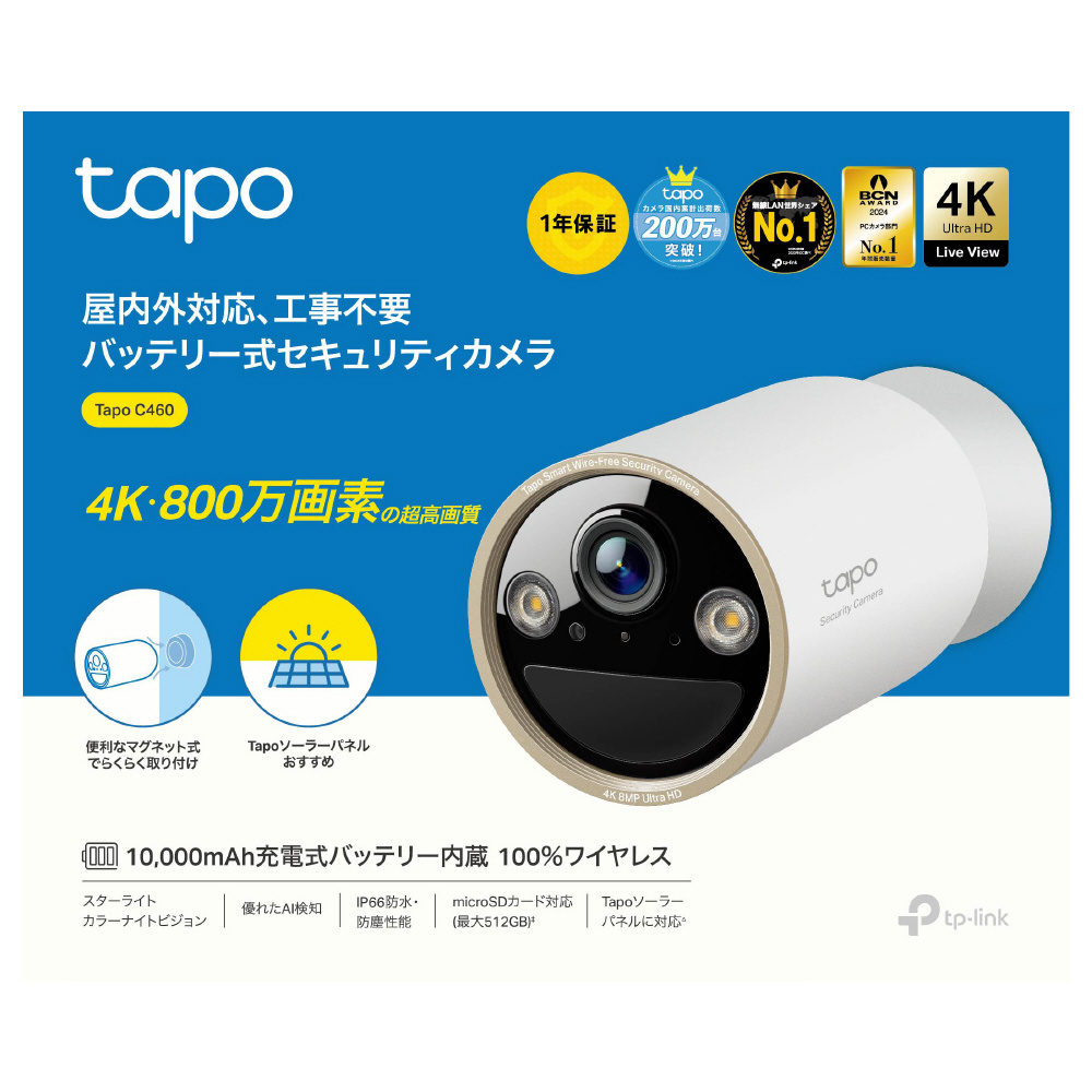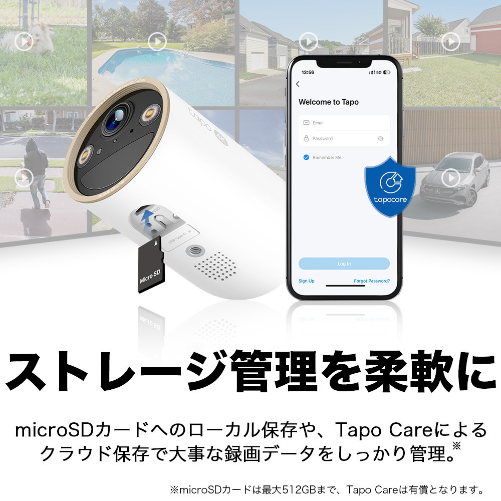 microSDカード (最大512GB) へのローカル保存や、Tapo Careサービス(有償)を利用したクラウド保存に対応しています。
