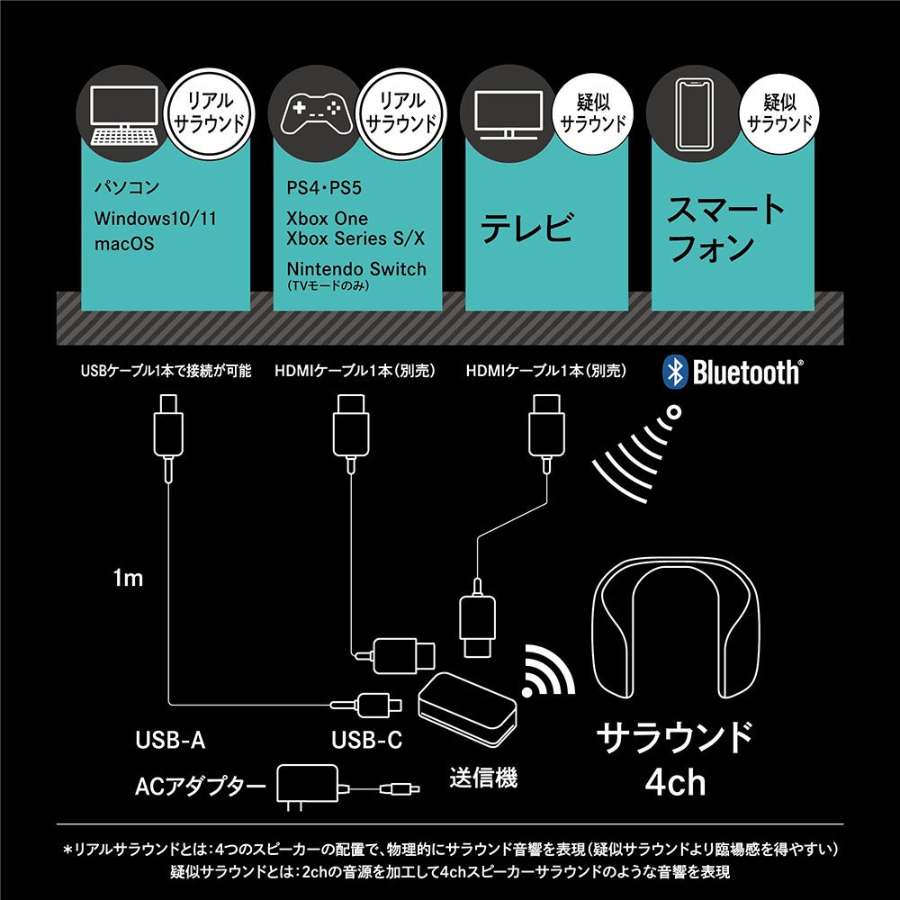 パソコン、PS4・PS5、Nintendo Switch(テレビモード時)、Xbox One・Series S/X、スマートフォン ※対応機器と接続してご使用になる前に、必ず、各対応機器の取扱説明書をご確認ください。