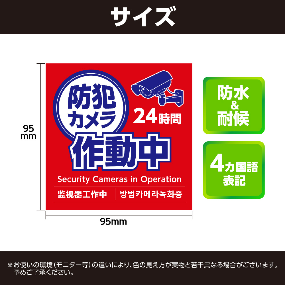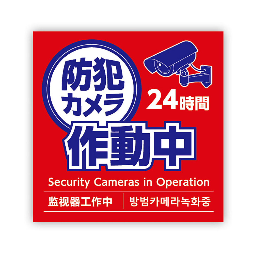 防犯効果をぐっと高める、防犯カメラ作動中ステッカーです。お店の入口や壁面に貼るだけで簡単に注意喚起ができます。防水加工済みで雨の日でも剥がれにくく、直射日光にも強い耐光インキを使用しているため、屋外でも長くご利用いただけます。また、このステッカーには英語、韓国語、中国語でも記載があり、異なる言語や文化を持つ方々にも伝わりやすく、多様な環境で効果的に注意を促すことができます。防犯対策の第一歩として、取り入れやすいステッカーです。