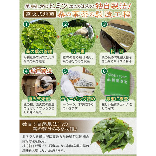 桑の葉を100%使用し、芳ばしく、まろやかな味わいに仕上げました。