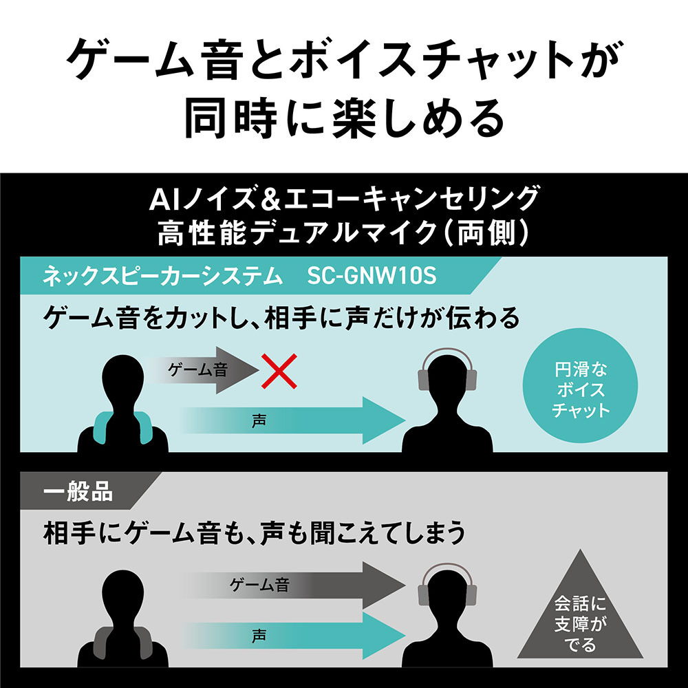 本体のネック部、左右にマイクを配置したことで、どちらを向いてもプレイヤーの声をとりこぼす心配がなく、さらに、高性能ボイスプロセッサーの採用によりゲームの音や周囲の音に干渉されず、人の声だけを識別してクリアに伝えます。