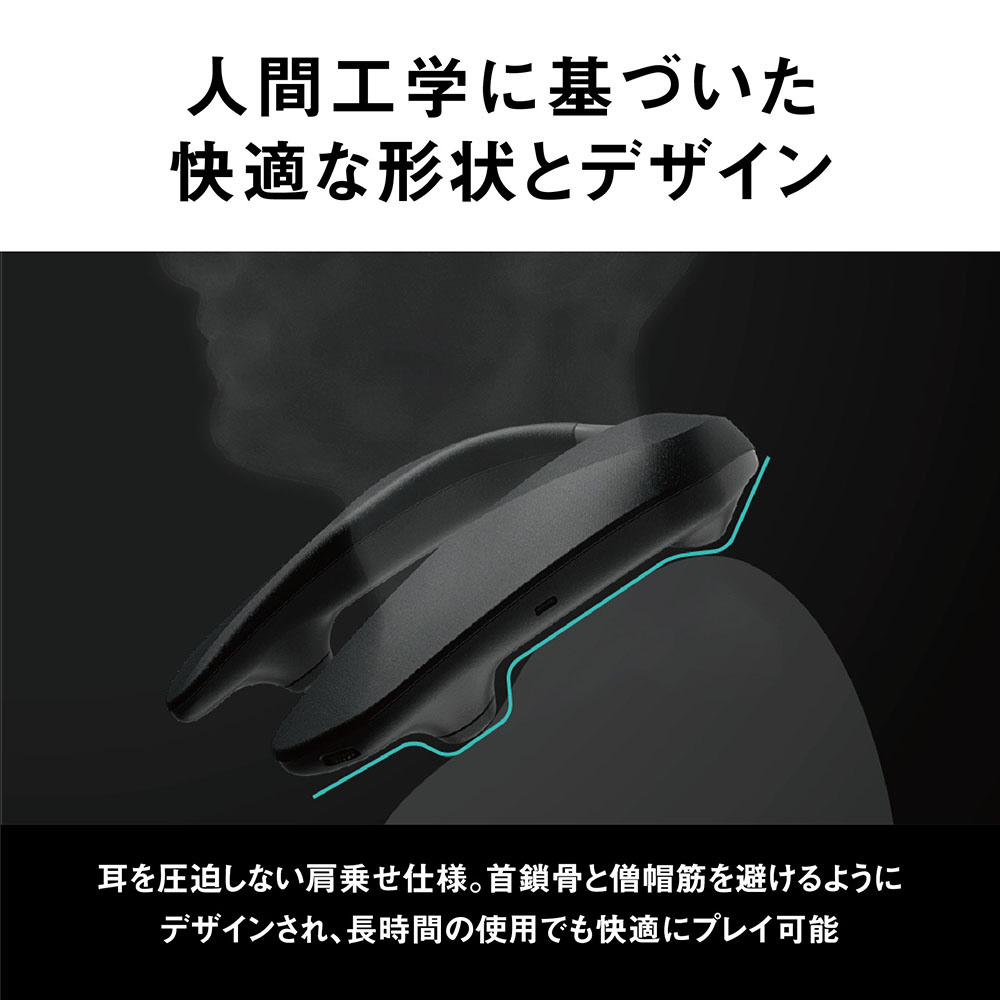 データ通信用低遅延専用無線モジュール採用により、パソコンやゲーム機に送信機※2を接続することでワイヤレス化を実現。ケーブルの制約から解放され、ゲームに没入※1できます。さらに、本体の左右4点で重さを分散する構造により、首回りのストレスを感じにくく、長時間プレイしても疲れず集中してゲームが楽しめます。