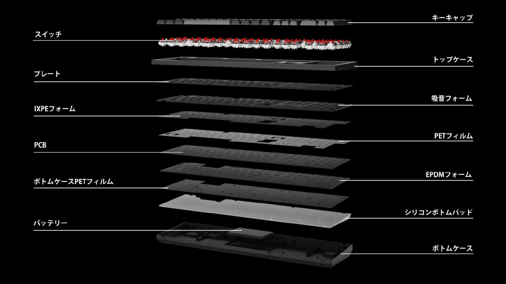 K10 Maxは、快適性を高める先進のIXPEアコースティック・フォームと、優れたキースイッチ・サポート、応答性、耐久性を実現する弾力性のあるEDPMフォームを採用。スチールプレートは、レスポンスの良いフィードバックと穏やかなタイピングサウンドを提供し、重量を加えることで安定性を高めます。