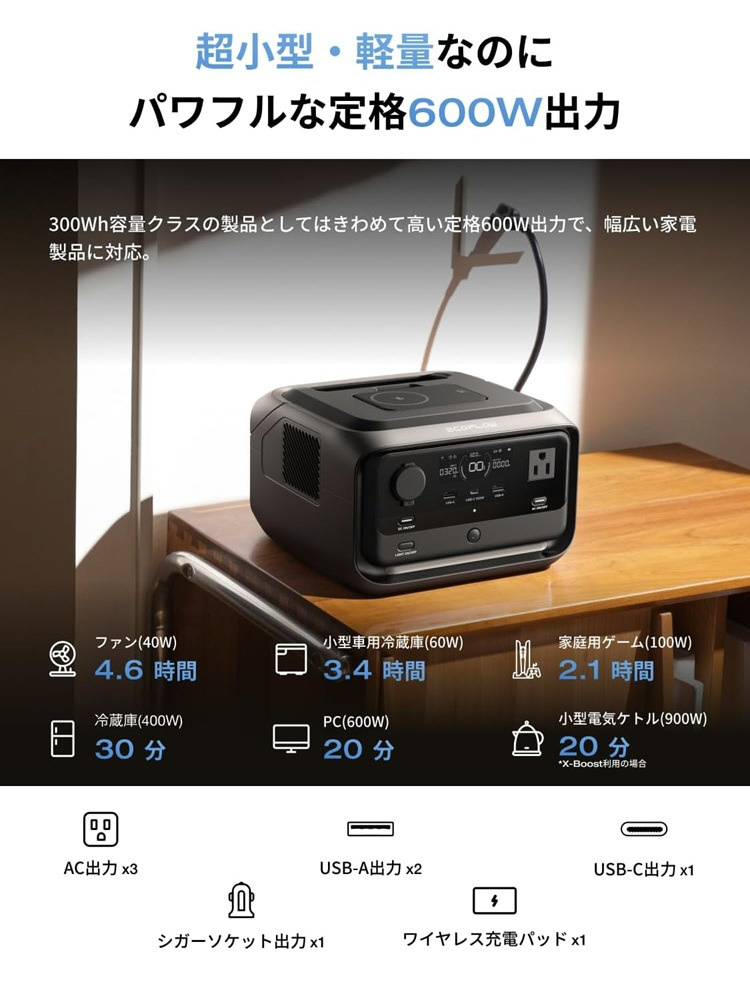 X-GaNPowerにより、停電時にはスマホなどの通信機器の使用時間を最大2倍に延長しアウトドアでは家族との幸せな時間をさらに長く楽しめます。