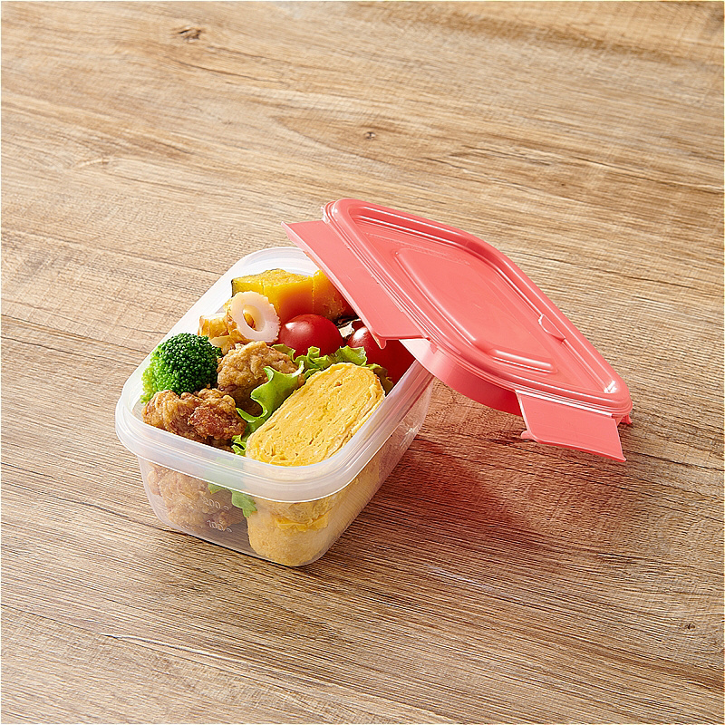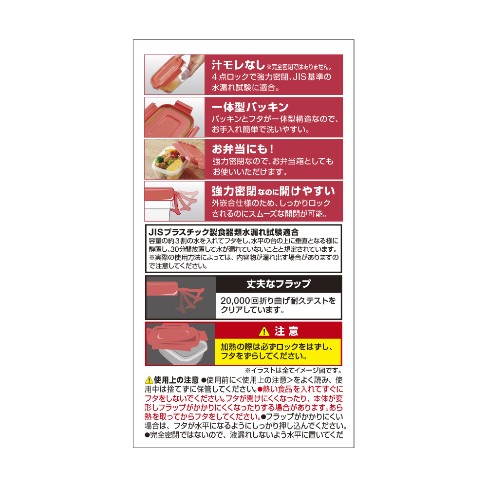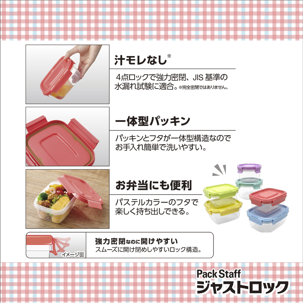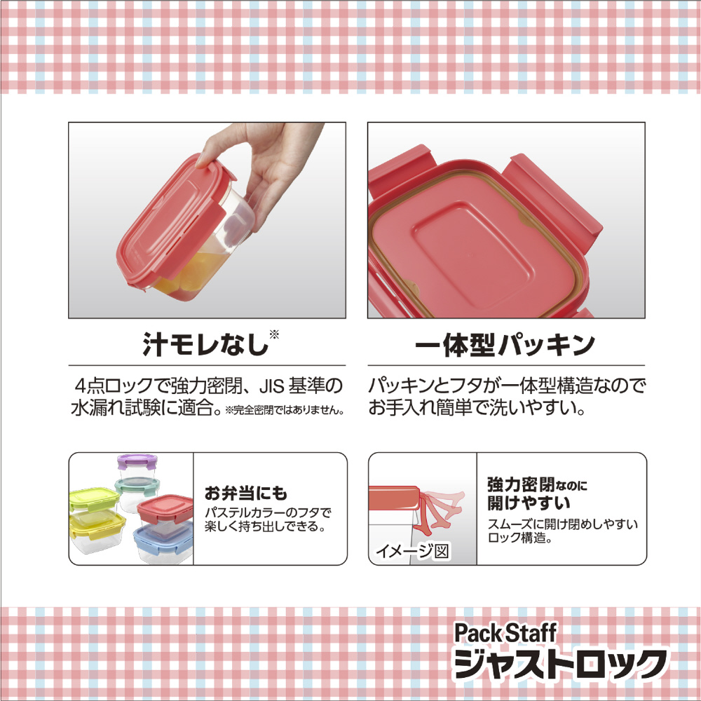 ■食品の保存からお弁当などの持ち出しまで幅広く使えるカラフルな4点ロック保存容器。<BR>■JIS水漏れ試験適合で汁モレなし。(※完全密閉ではありません)<BR>■強力密閉なのに開閉しやすく、冷凍・レンジ加熱OK。<BR>■フタとパッキンが一体型構造なので、取り外して洗う手間がなくなり、お手入れも簡単。