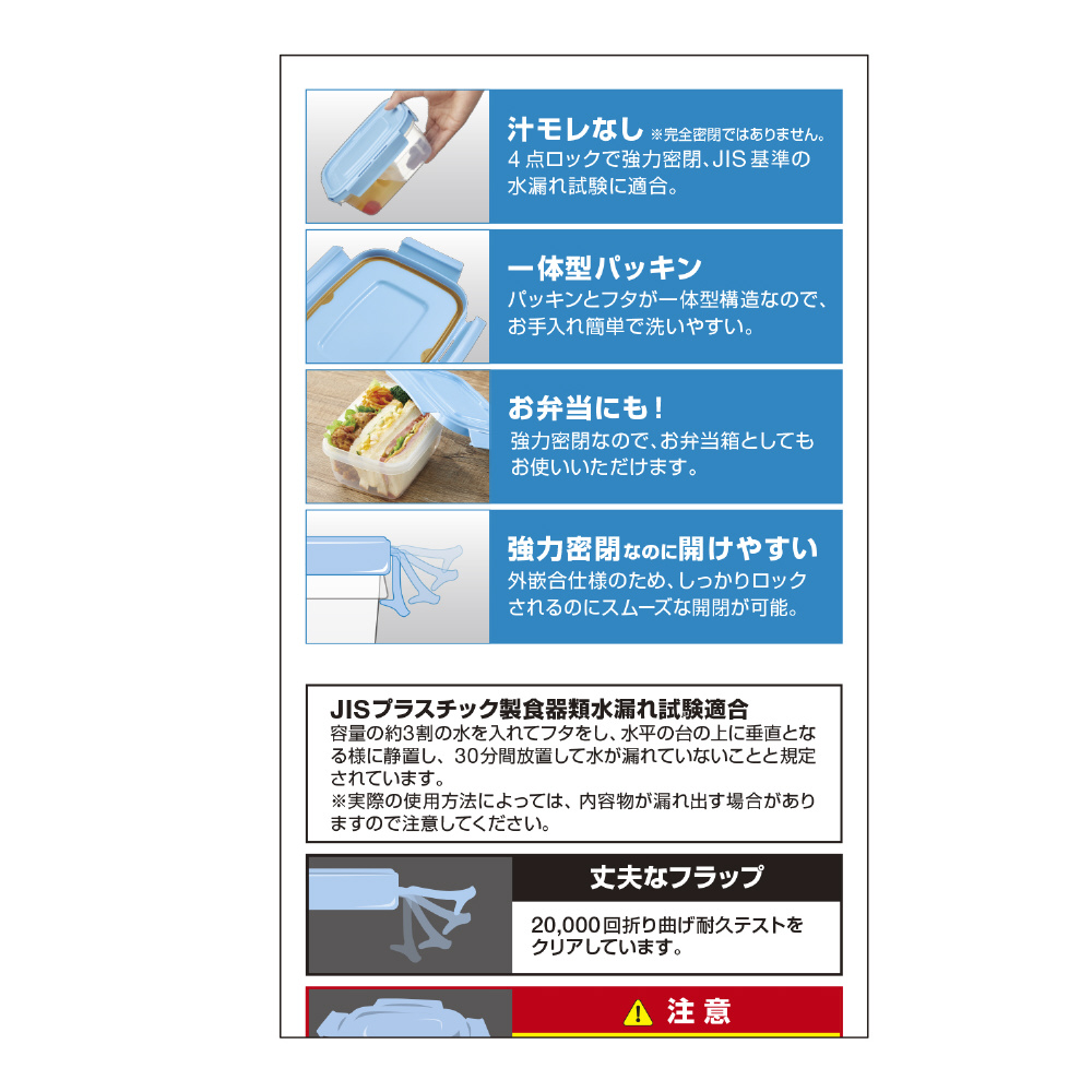 ■食品の保存からお弁当などの持ち出しまで幅広く使えるカラフルな4点ロック保存容器。<BR>■JIS水漏れ試験適合で汁モレなし。(※完全密閉ではありません)<BR>■強力密閉なのに開閉しやすく、冷凍・レンジ加熱OK。<BR>■フタとパッキンが一体型構造なので、取り外して洗う手間がなくなり、お手入れも簡単。