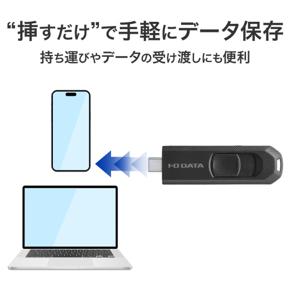 本商品は、USB-Cコネクターを搭載したスライド式USBメモリーです。パソコンはもちろん、iPhoneやAndroidスマホなどUSB-Cポートを備えた幅広い機器でお使いいただけます。