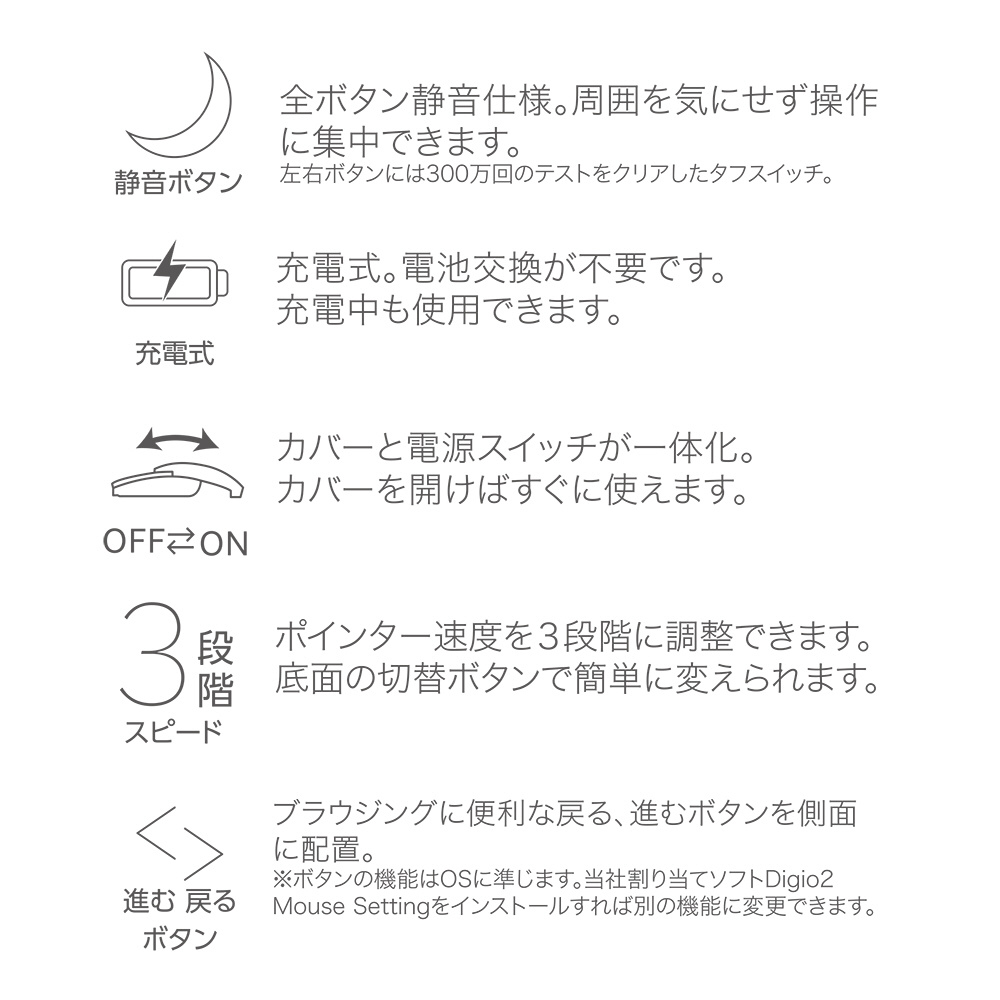 ※ボタンの機能はOSに準じます。当社割り当てソフトDigio2MouseSettingをインストールすれば別の機能に変更できます。