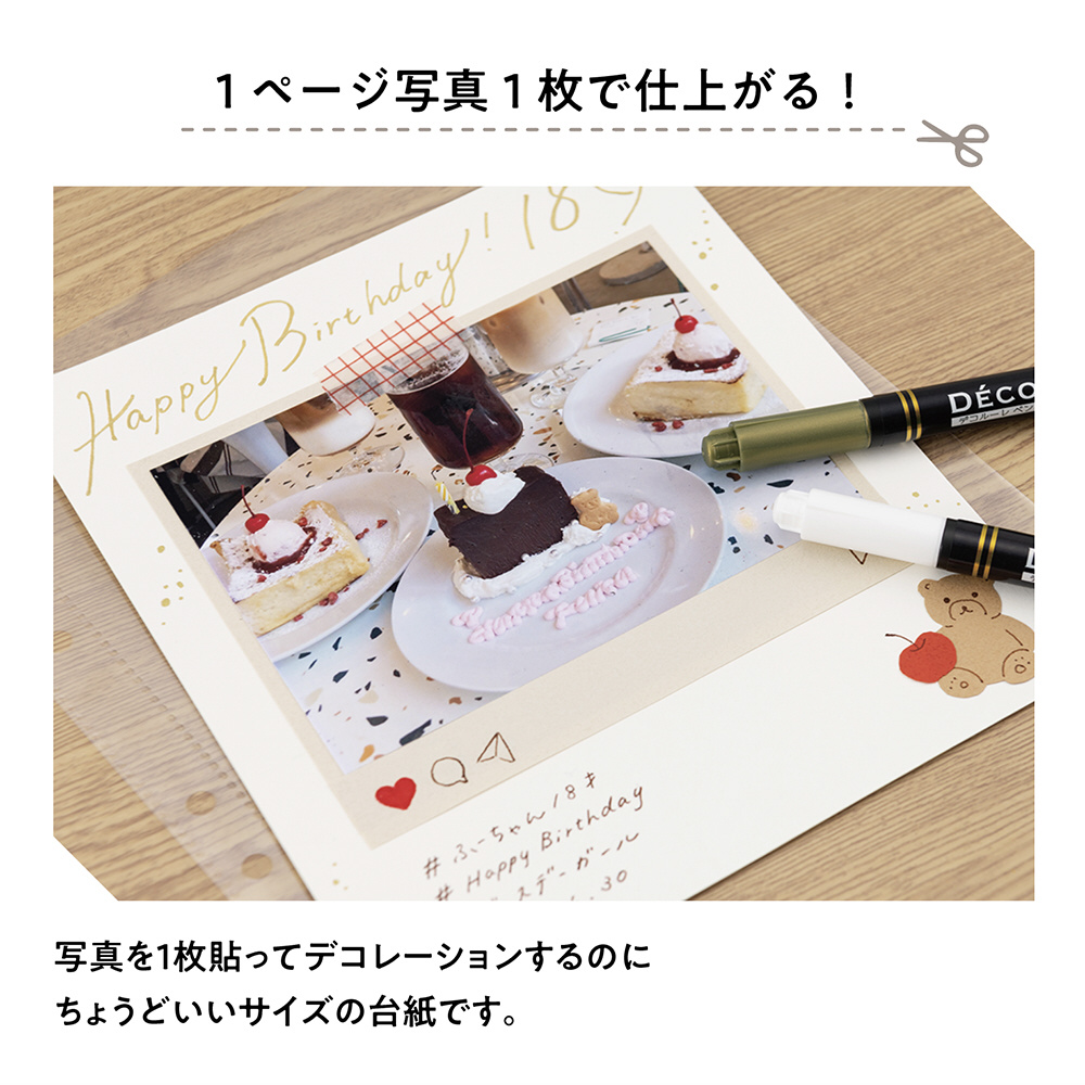 写真を一枚貼ってデコレーションするのにちょうどいいサイズの台紙です。
