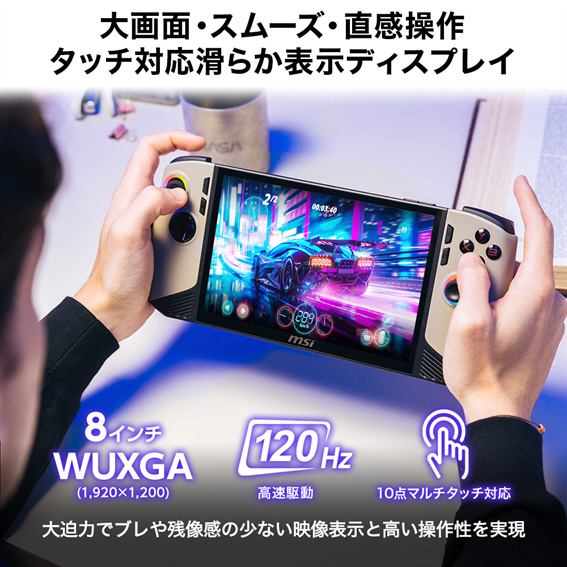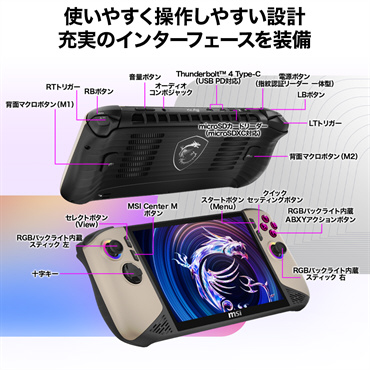 [各種ボタン] RGBバックライト内蔵スティック(左/右) RGBバックライト内蔵ABXYアクションボタン 十字キー LB/RB ボタン LT/RT トリガー セレクトボタン(View) MSI Center M ボタン スタートボタン(Menu) クイックセッティングボタン 背面マクロボタン(M1/M2) 音量ボタン 電源ボタン(指紋認証リーダー一体型)