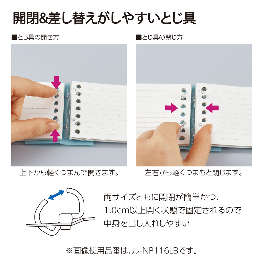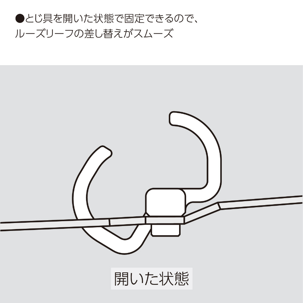 ●綴じ具が広く開いて中紙の差し替えもスムーズ。
